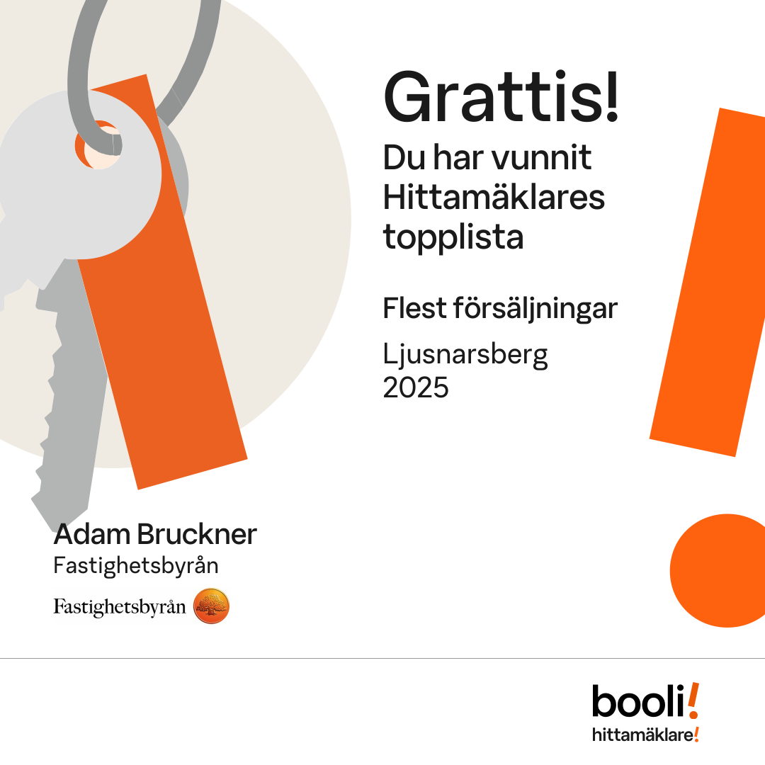 Statistik för publicerade bostäder, försäljningar och omdömen baseras på data från Booli och Hittamäklare. Statistiken för försäljningar avser inrapporterade och verifierade slutpriser från mäklare eller av Booli inhämtade och verifierade slutpriser. Statistiken för publicerade bostäder baseras på information som publicerats på Booli.se. Statistik för omdömen och rekommendationer baseras på omdömen från säljare som lämnats via Booli och Hittamäklare.