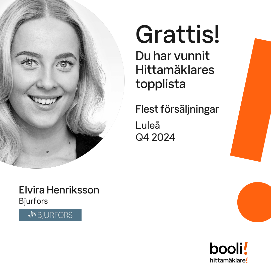 Statistik för publicerade bostäder, försäljningar och omdömen baseras på data från Booli och Hittamäklare. Statistiken för försäljningar avser inrapporterade och verifierade slutpriser från mäklare eller av Booli inhämtade och verifierade slutpriser. Statistiken för publicerade bostäder baseras på information som publicerats på Booli.se. Statistik för omdömen och rekommendationer baseras på omdömen från säljare som lämnats via Booli och Hittamäklare.
