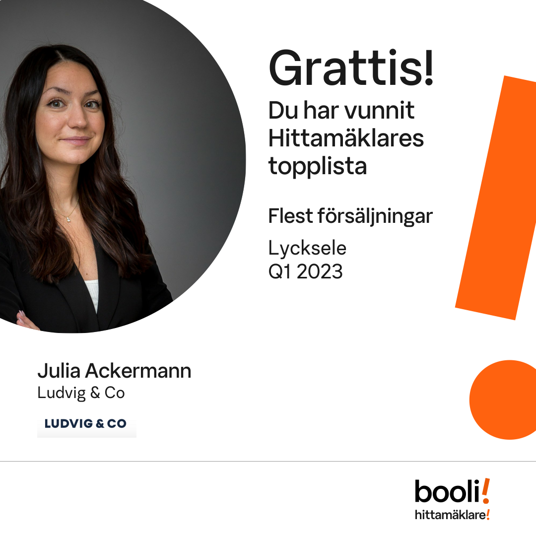 Statistik för publicerade bostäder, försäljningar och omdömen baseras på data från Booli och Hittamäklare. Statistiken för försäljningar avser inrapporterade och verifierade slutpriser från mäklare eller av Booli inhämtade och verifierade slutpriser. Statistiken för publicerade bostäder baseras på information som publicerats på Booli.se. Statistik för omdömen och rekommendationer baseras på omdömen från säljare som lämnats via Booli och Hittamäklare.