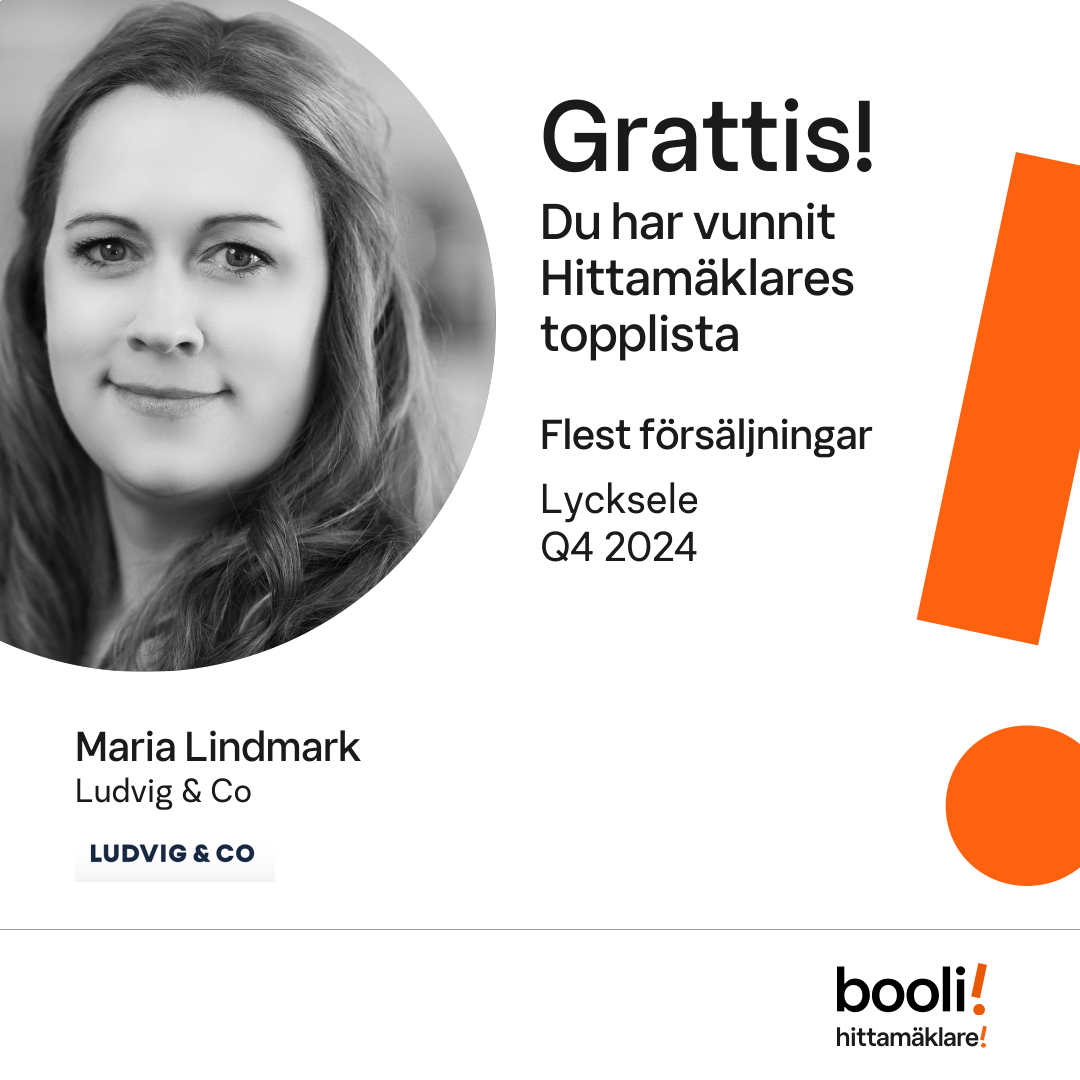 Statistik för publicerade bostäder, försäljningar och omdömen baseras på data från Booli och Hittamäklare. Statistiken för försäljningar avser inrapporterade och verifierade slutpriser från mäklare eller av Booli inhämtade och verifierade slutpriser. Statistiken för publicerade bostäder baseras på information som publicerats på Booli.se. Statistik för omdömen och rekommendationer baseras på omdömen från säljare som lämnats via Booli och Hittamäklare.