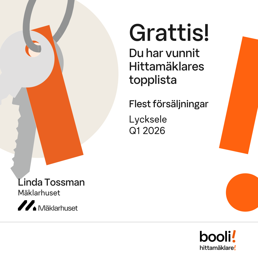 Statistik för publicerade bostäder, försäljningar och omdömen baseras på data från Booli. Statistiken för försäljningar avser inrapporterade och verifierade slutpriser från mäklare eller av Booli inhämtade och verifierade slutpriser. Statistiken för publicerade bostäder baseras på information som publicerats på Booli.se. Statistik för omdömen och rekommendationer baseras på omdömen från säljare som lämnats via Booli.