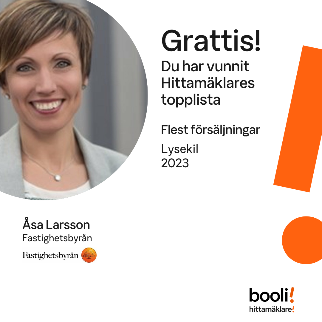 Statistik för publicerade bostäder, försäljningar och omdömen baseras på data från Booli och Hittamäklare. Statistiken för försäljningar avser inrapporterade och verifierade slutpriser från mäklare eller av Booli inhämtade och verifierade slutpriser. Statistiken för publicerade bostäder baseras på information som publicerats på Booli.se. Statistik för omdömen och rekommendationer baseras på omdömen från säljare som lämnats via Booli och Hittamäklare.