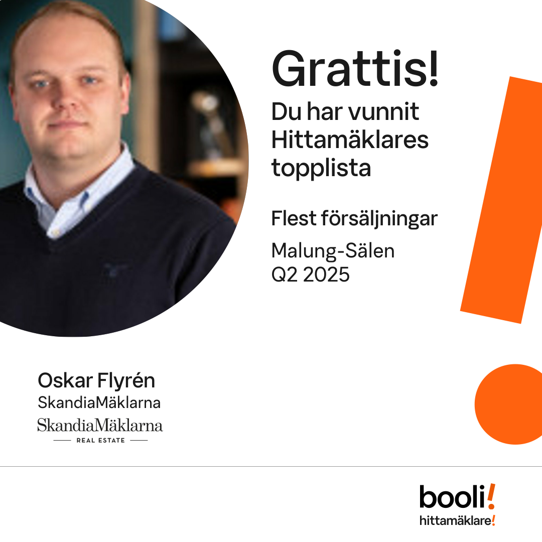 Statistik för publicerade bostäder, försäljningar och omdömen baseras på data från Booli och Hittamäklare. Statistiken för försäljningar avser inrapporterade och verifierade slutpriser från mäklare eller av Booli inhämtade och verifierade slutpriser. Statistiken för publicerade bostäder baseras på information som publicerats på Booli.se. Statistik för omdömen och rekommendationer baseras på omdömen från säljare som lämnats via Booli och Hittamäklare.