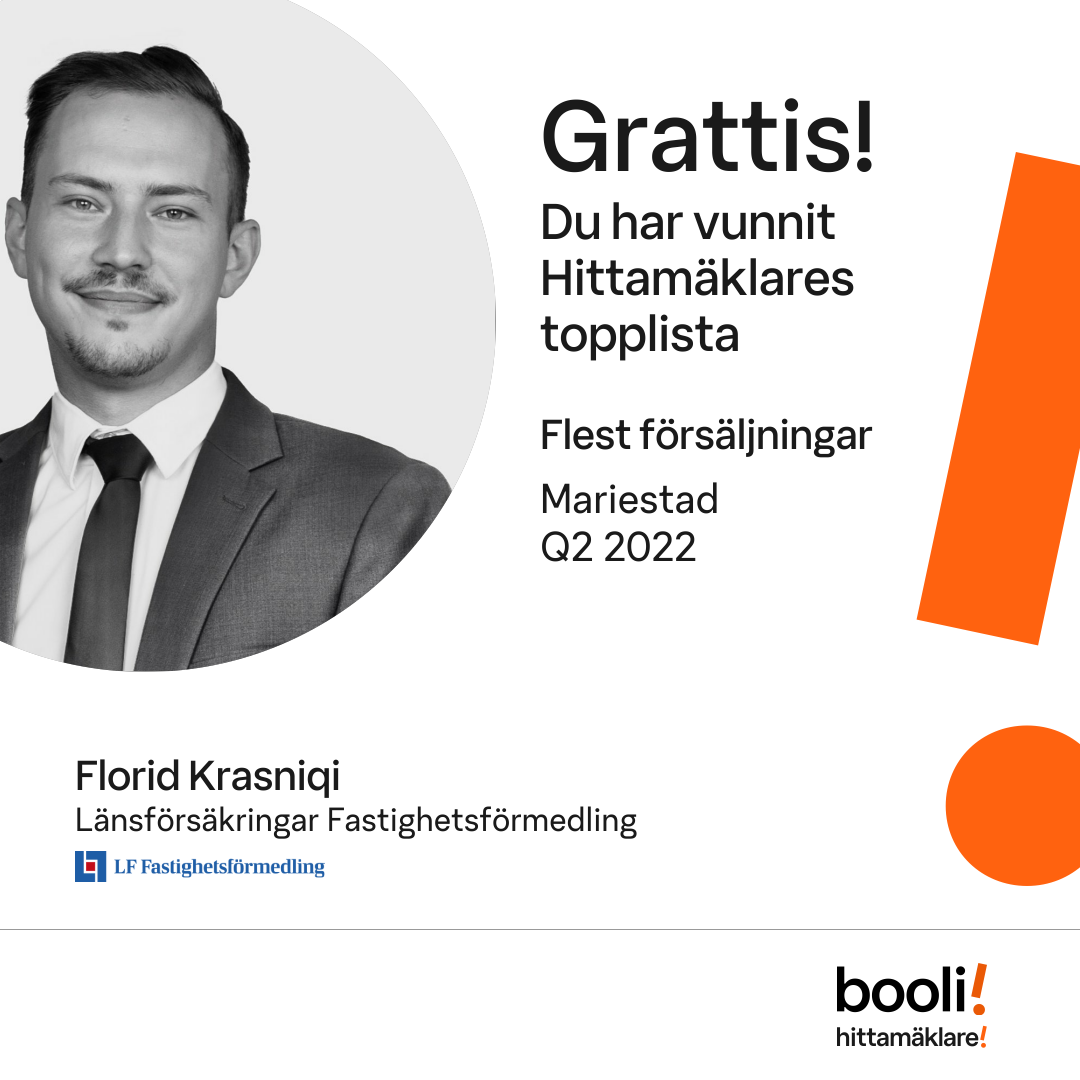 Statistik för publicerade bostäder, försäljningar och omdömen baseras på data från Booli och Hittamäklare. Statistiken för försäljningar avser inrapporterade och verifierade slutpriser från mäklare eller av Booli inhämtade och verifierade slutpriser. Statistiken för publicerade bostäder baseras på information som publicerats på Booli.se. Statistik för omdömen och rekommendationer baseras på omdömen från säljare som lämnats via Booli och Hittamäklare.
