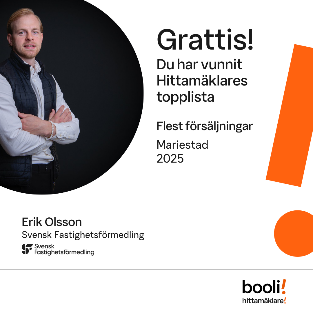 Statistik för publicerade bostäder, försäljningar och omdömen baseras på data från Booli och Hittamäklare. Statistiken för försäljningar avser inrapporterade och verifierade slutpriser från mäklare eller av Booli inhämtade och verifierade slutpriser. Statistiken för publicerade bostäder baseras på information som publicerats på Booli.se. Statistik för omdömen och rekommendationer baseras på omdömen från säljare som lämnats via Booli och Hittamäklare.