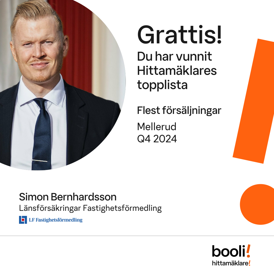 Statistik för publicerade bostäder, försäljningar och omdömen baseras på data från Booli och Hittamäklare. Statistiken för försäljningar avser inrapporterade och verifierade slutpriser från mäklare eller av Booli inhämtade och verifierade slutpriser. Statistiken för publicerade bostäder baseras på information som publicerats på Booli.se. Statistik för omdömen och rekommendationer baseras på omdömen från säljare som lämnats via Booli och Hittamäklare.