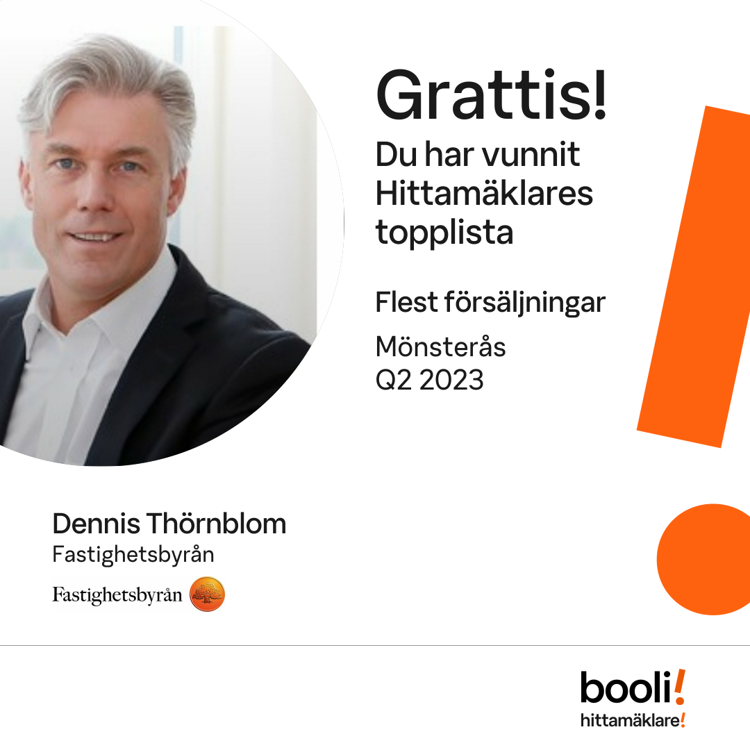 Statistik för publicerade bostäder, försäljningar och omdömen baseras på data från Booli och Hittamäklare. Statistiken för försäljningar avser inrapporterade och verifierade slutpriser från mäklare eller av Booli inhämtade och verifierade slutpriser. Statistiken för publicerade bostäder baseras på information som publicerats på Booli.se. Statistik för omdömen och rekommendationer baseras på omdömen från säljare som lämnats via Booli och Hittamäklare.