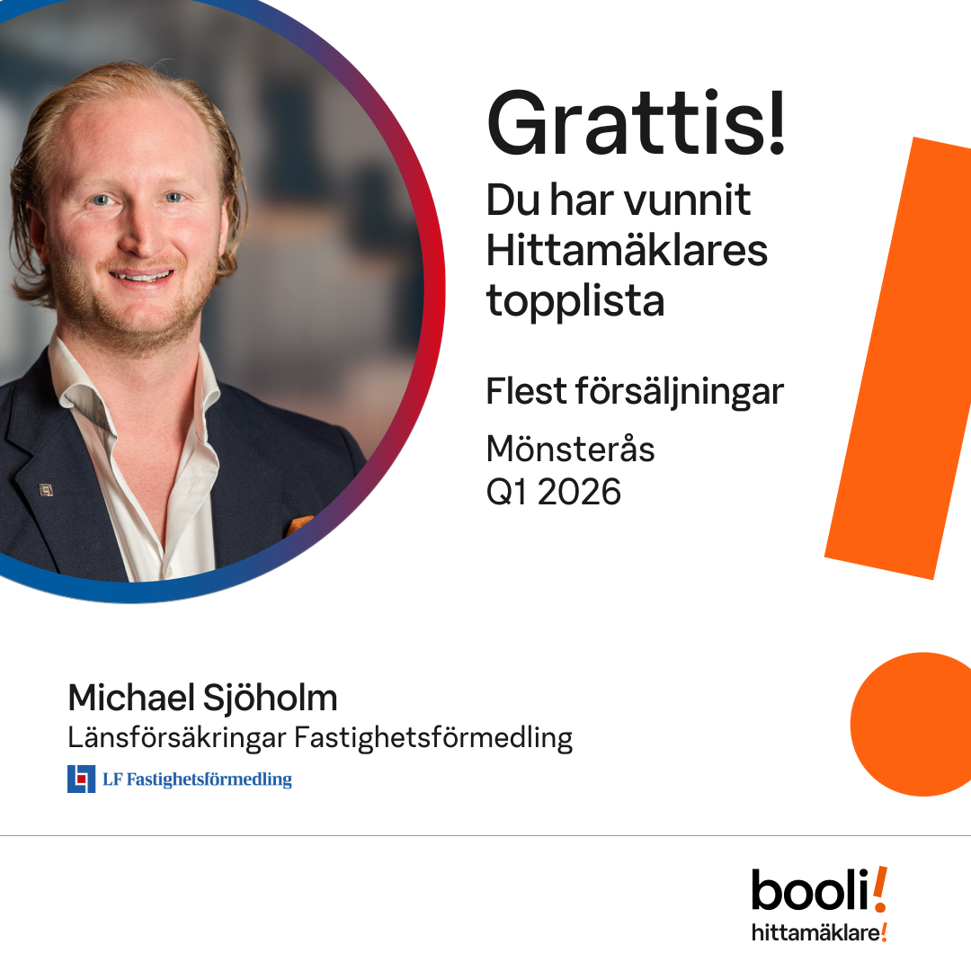 Statistik för publicerade bostäder, försäljningar och omdömen baseras på data från Booli. Statistiken för försäljningar avser inrapporterade och verifierade slutpriser från mäklare eller av Booli inhämtade och verifierade slutpriser. Statistiken för publicerade bostäder baseras på information som publicerats på Booli.se. Statistik för omdömen och rekommendationer baseras på omdömen från säljare som lämnats via Booli.