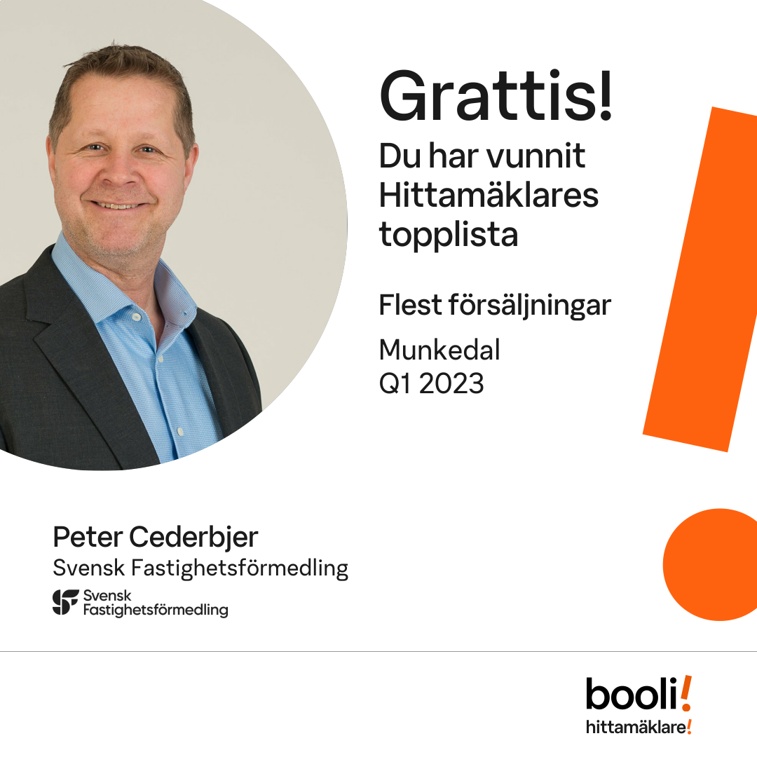 Statistik för publicerade bostäder, försäljningar och omdömen baseras på data från Booli och Hittamäklare. Statistiken för försäljningar avser inrapporterade och verifierade slutpriser från mäklare eller av Booli inhämtade och verifierade slutpriser. Statistiken för publicerade bostäder baseras på information som publicerats på Booli.se. Statistik för omdömen och rekommendationer baseras på omdömen från säljare som lämnats via Booli och Hittamäklare.