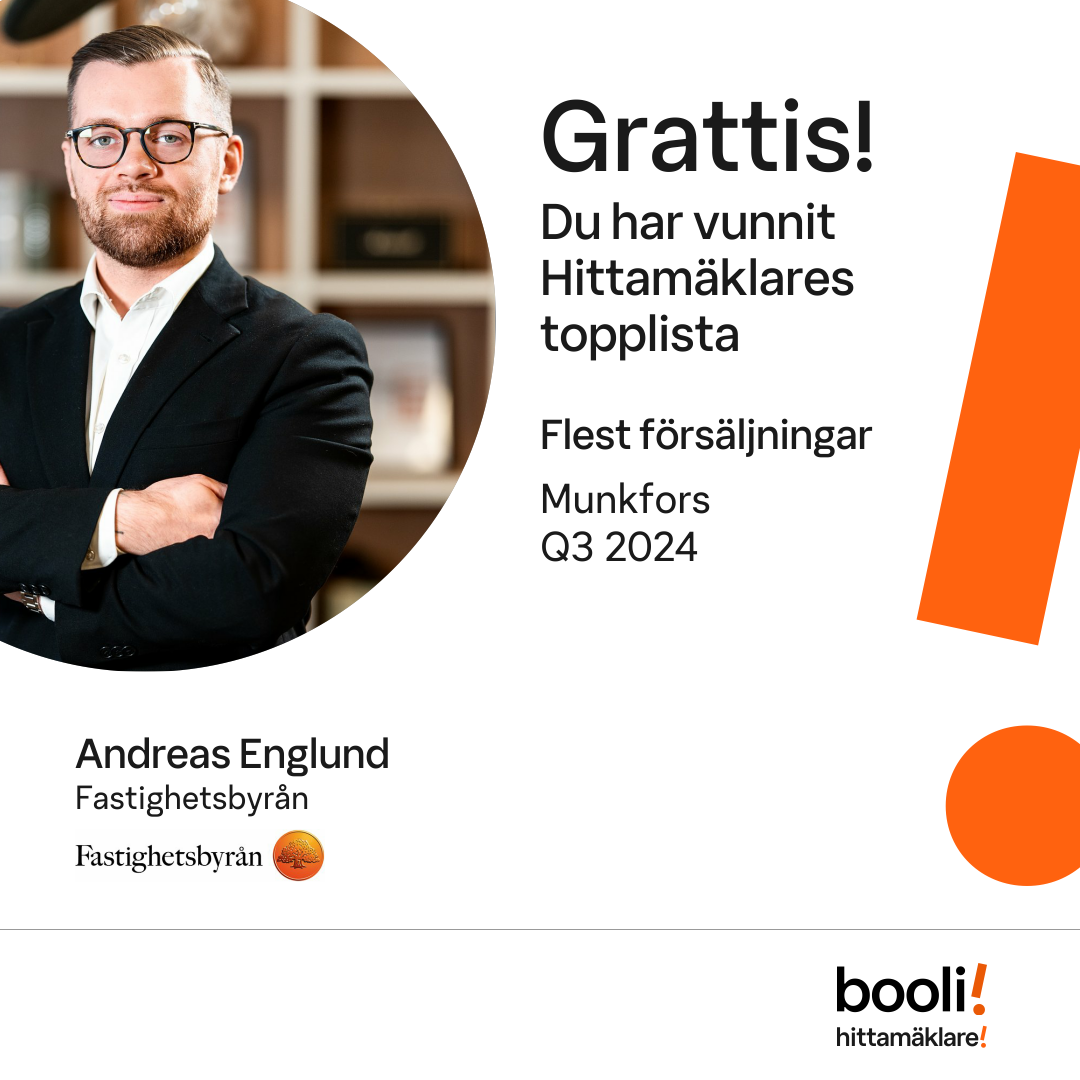 Statistik för publicerade bostäder, försäljningar och omdömen baseras på data från Booli och Hittamäklare. Statistiken för försäljningar avser inrapporterade och verifierade slutpriser från mäklare eller av Booli inhämtade och verifierade slutpriser. Statistiken för publicerade bostäder baseras på information som publicerats på Booli.se. Statistik för omdömen och rekommendationer baseras på omdömen från säljare som lämnats via Booli och Hittamäklare.