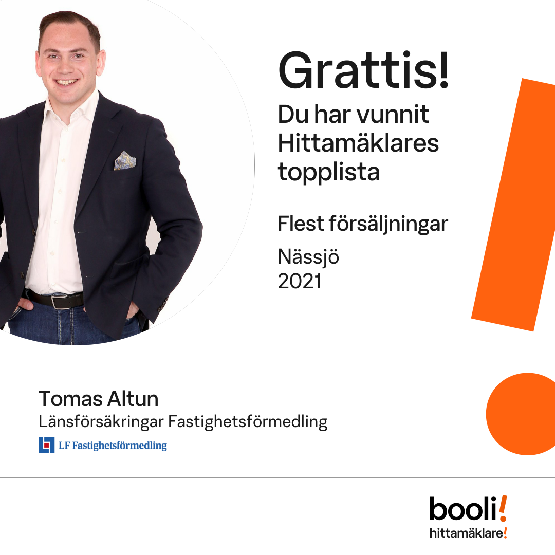 Statistik för publicerade bostäder, försäljningar och omdömen baseras på data från Booli och Hittamäklare. Statistiken för försäljningar avser inrapporterade och verifierade slutpriser från mäklare eller av Booli inhämtade och verifierade slutpriser. Statistiken för publicerade bostäder baseras på information som publicerats på Booli.se. Statistik för omdömen och rekommendationer baseras på omdömen från säljare som lämnats via Booli och Hittamäklare.