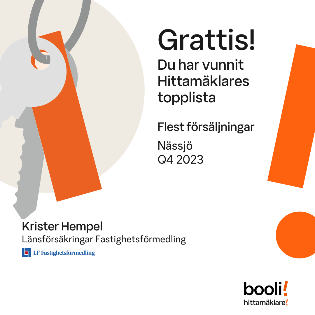 Statistik för publicerade bostäder, försäljningar och omdömen baseras på data från Booli och Hittamäklare. Statistiken för försäljningar avser inrapporterade och verifierade slutpriser från mäklare eller av Booli inhämtade och verifierade slutpriser. Statistiken för publicerade bostäder baseras på information som publicerats på Booli.se. Statistik för omdömen och rekommendationer baseras på omdömen från säljare som lämnats via Booli och Hittamäklare.