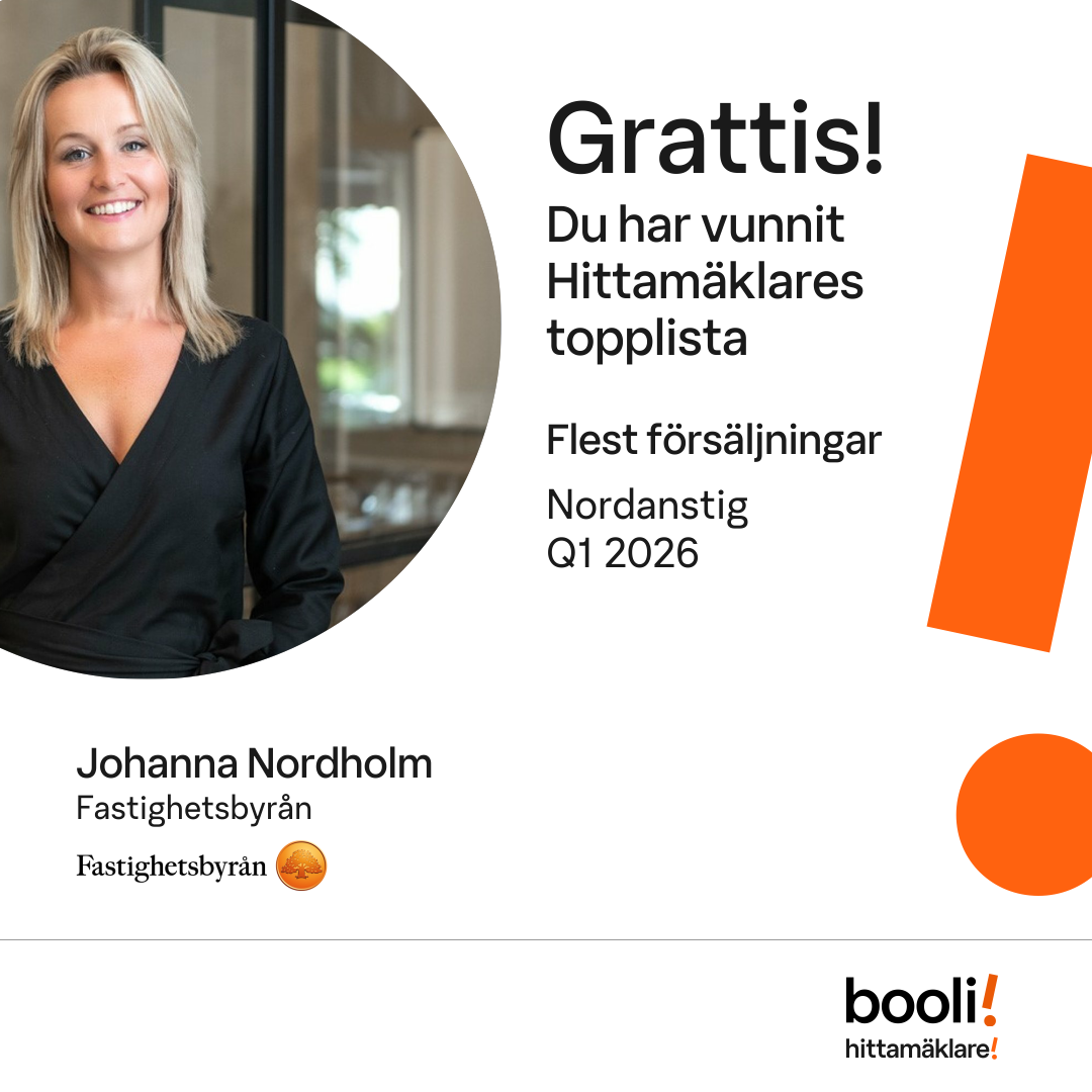 Statistik för publicerade bostäder, försäljningar och omdömen baseras på data från Booli. Statistiken för försäljningar avser inrapporterade och verifierade slutpriser från mäklare eller av Booli inhämtade och verifierade slutpriser. Statistiken för publicerade bostäder baseras på information som publicerats på Booli.se. Statistik för omdömen och rekommendationer baseras på omdömen från säljare som lämnats via Booli.