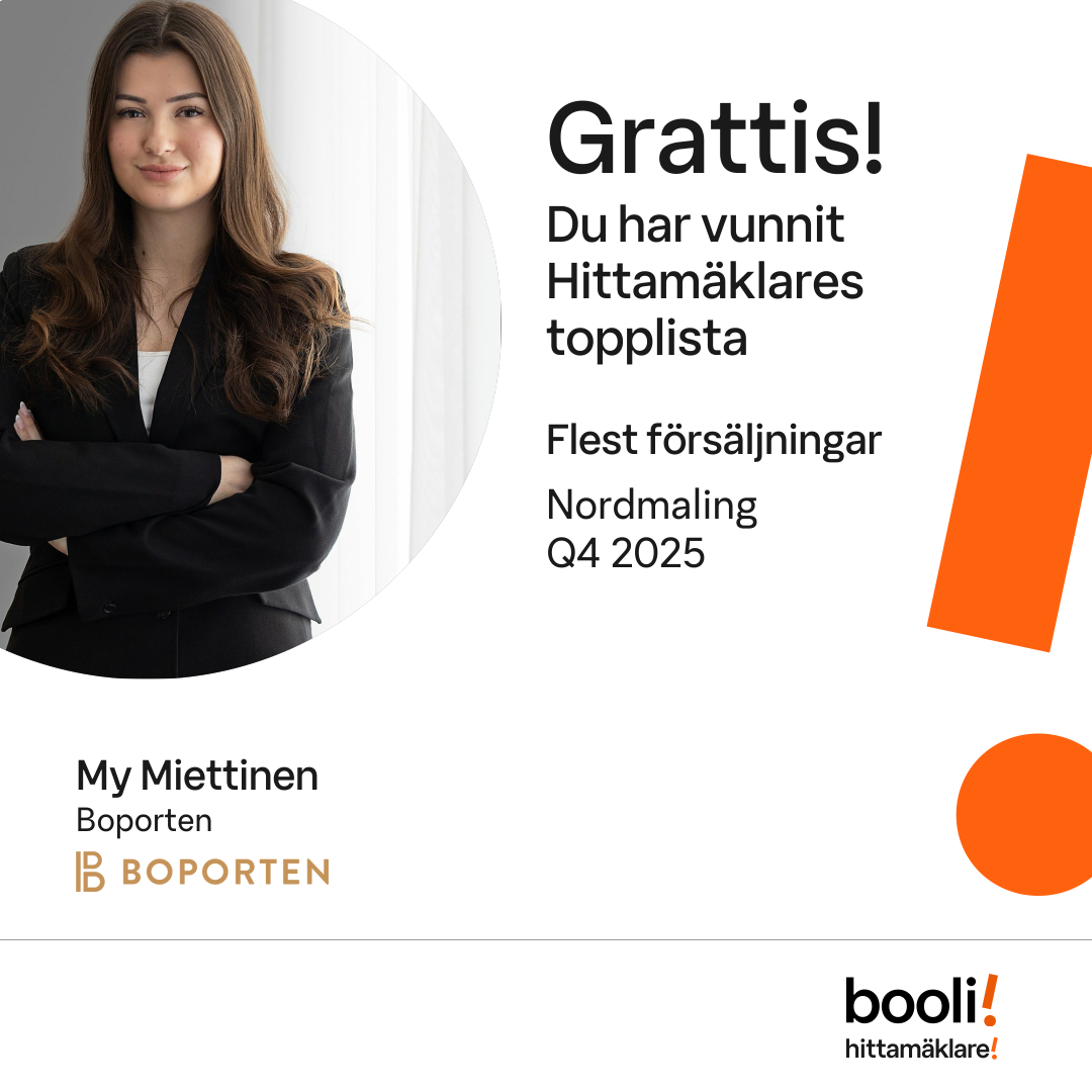 Statistik för publicerade bostäder, försäljningar och omdömen baseras på data från Booli och Hittamäklare. Statistiken för försäljningar avser inrapporterade och verifierade slutpriser från mäklare eller av Booli inhämtade och verifierade slutpriser. Statistiken för publicerade bostäder baseras på information som publicerats på Booli.se. Statistik för omdömen och rekommendationer baseras på omdömen från säljare som lämnats via Booli och Hittamäklare.