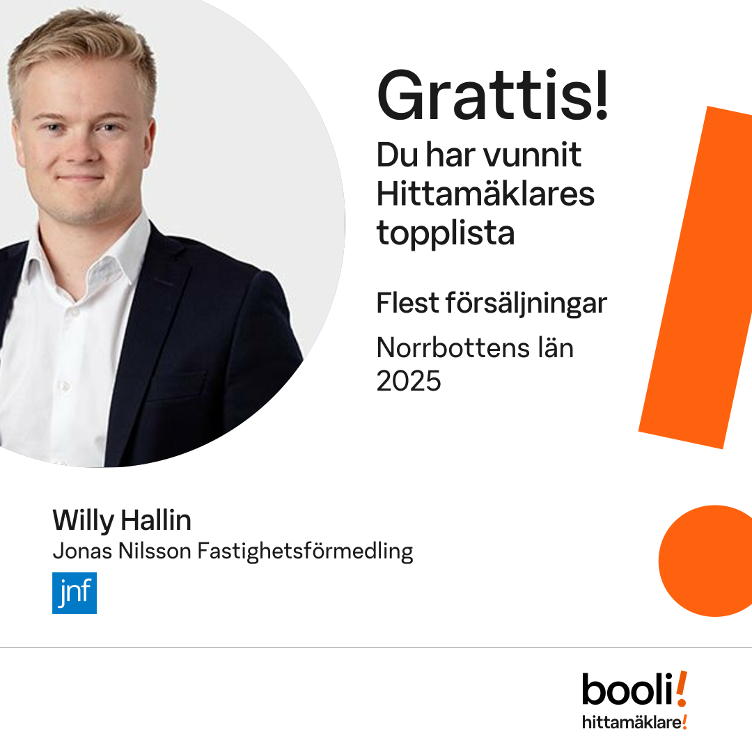 Statistik för publicerade bostäder, försäljningar och omdömen baseras på data från Booli och Hittamäklare. Statistiken för försäljningar avser inrapporterade och verifierade slutpriser från mäklare eller av Booli inhämtade och verifierade slutpriser. Statistiken för publicerade bostäder baseras på information som publicerats på Booli.se. Statistik för omdömen och rekommendationer baseras på omdömen från säljare som lämnats via Booli och Hittamäklare.