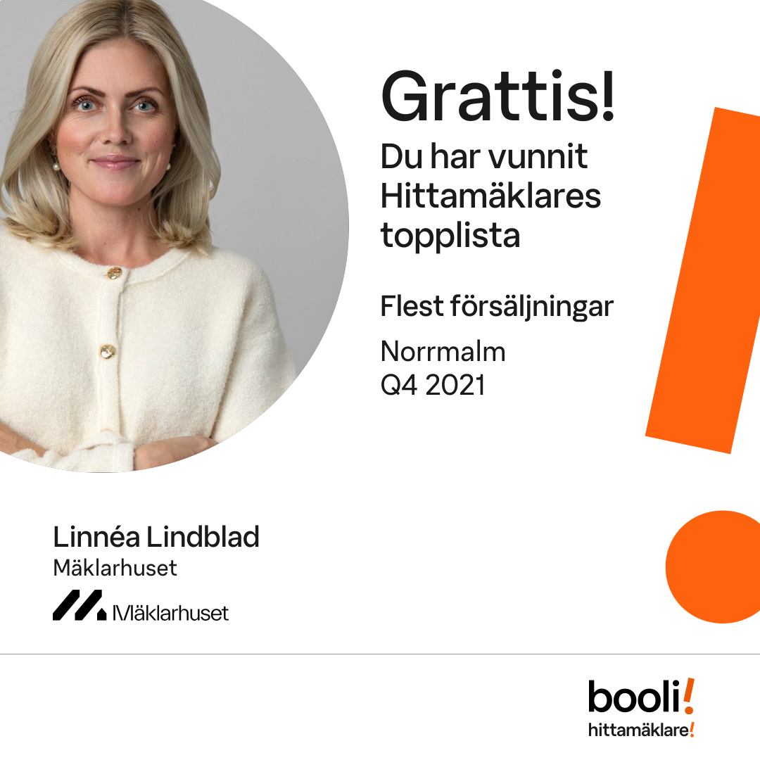 Statistik för publicerade bostäder, försäljningar och omdömen baseras på data från Booli och Hittamäklare. Statistiken för försäljningar avser inrapporterade och verifierade slutpriser från mäklare eller av Booli inhämtade och verifierade slutpriser. Statistiken för publicerade bostäder baseras på information som publicerats på Booli.se. Statistik för omdömen och rekommendationer baseras på omdömen från säljare som lämnats via Booli och Hittamäklare.