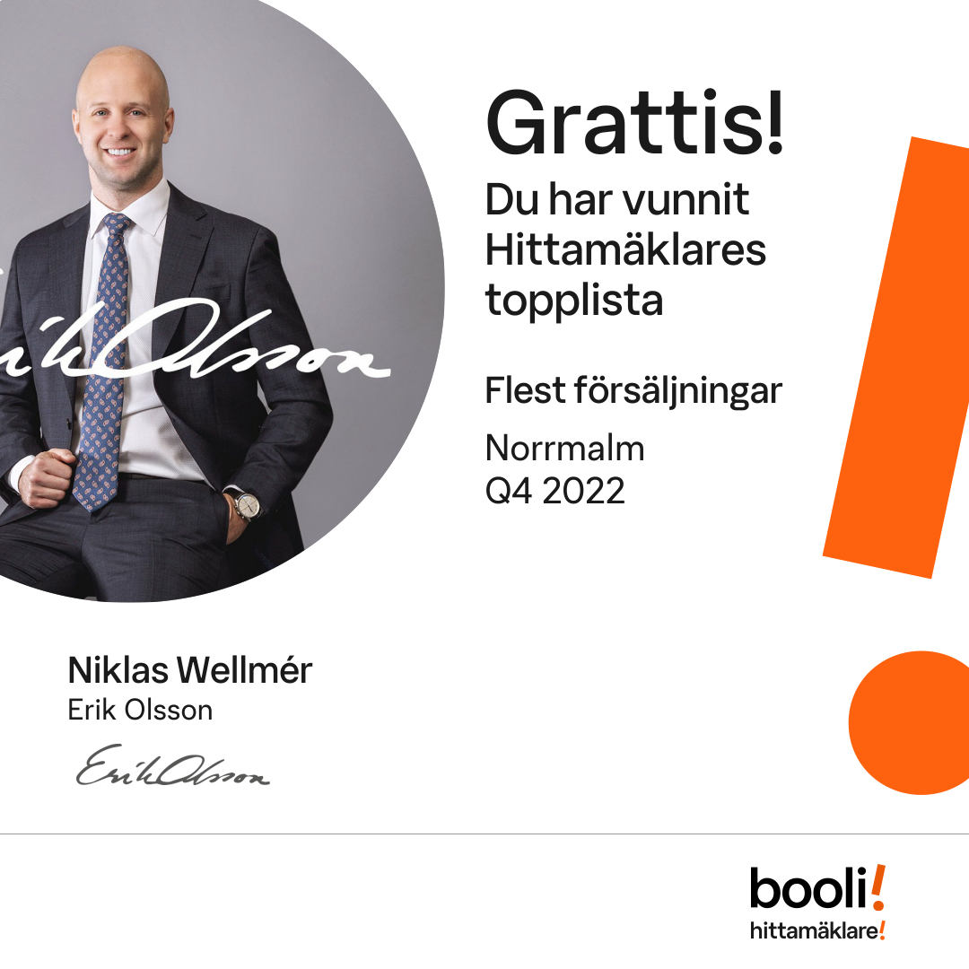 Statistik för publicerade bostäder, försäljningar och omdömen baseras på data från Booli och Hittamäklare. Statistiken för försäljningar avser inrapporterade och verifierade slutpriser från mäklare eller av Booli inhämtade och verifierade slutpriser. Statistiken för publicerade bostäder baseras på information som publicerats på Booli.se. Statistik för omdömen och rekommendationer baseras på omdömen från säljare som lämnats via Booli och Hittamäklare.
