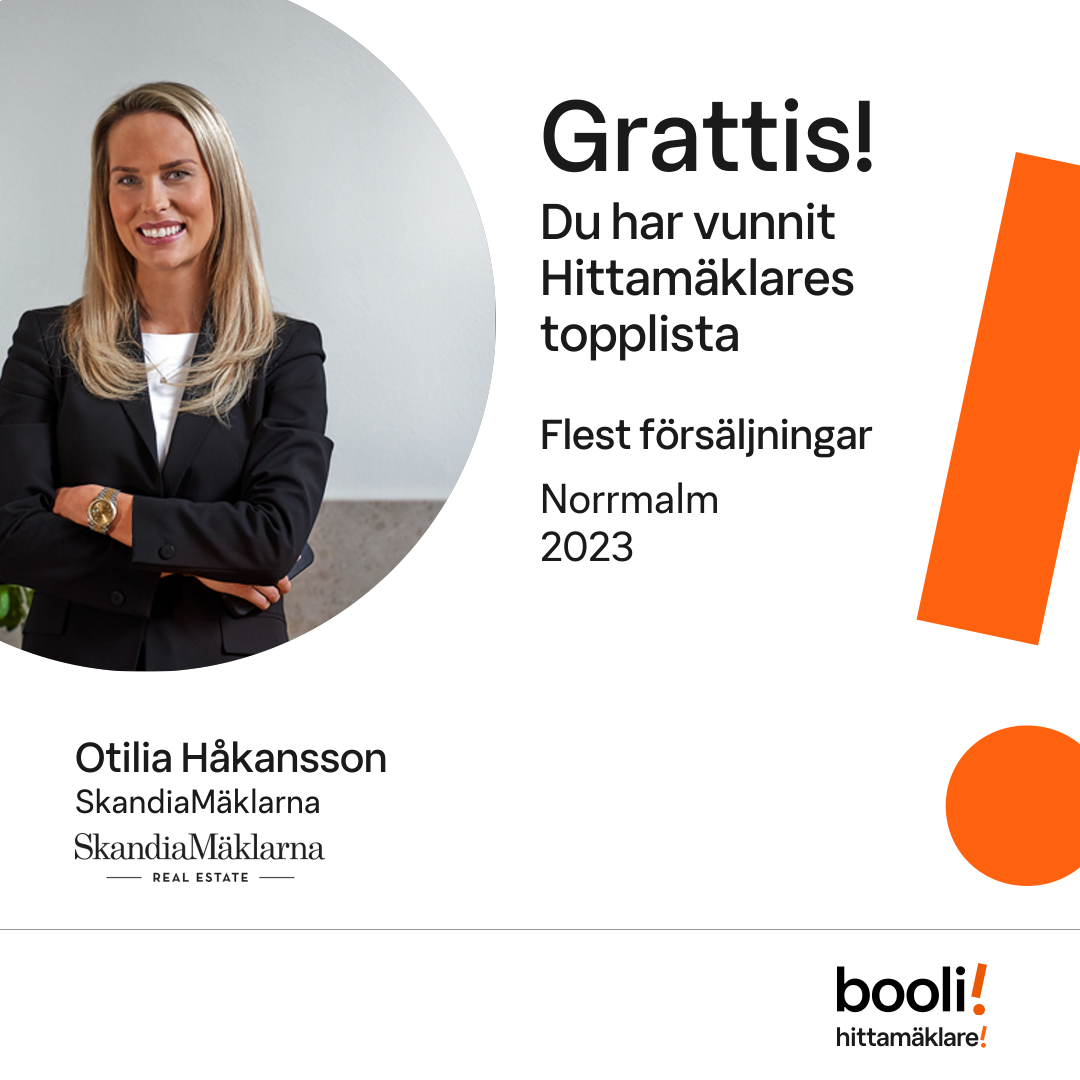 Statistik för publicerade bostäder, försäljningar och omdömen baseras på data från Booli och Hittamäklare. Statistiken för försäljningar avser inrapporterade och verifierade slutpriser från mäklare eller av Booli inhämtade och verifierade slutpriser. Statistiken för publicerade bostäder baseras på information som publicerats på Booli.se. Statistik för omdömen och rekommendationer baseras på omdömen från säljare som lämnats via Booli och Hittamäklare.