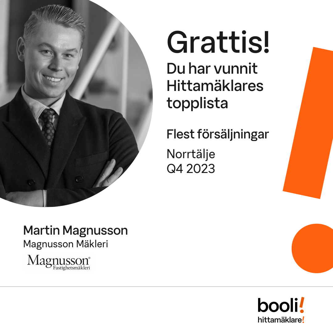 Statistik för publicerade bostäder, försäljningar och omdömen baseras på data från Booli och Hittamäklare. Statistiken för försäljningar avser inrapporterade och verifierade slutpriser från mäklare eller av Booli inhämtade och verifierade slutpriser. Statistiken för publicerade bostäder baseras på information som publicerats på Booli.se. Statistik för omdömen och rekommendationer baseras på omdömen från säljare som lämnats via Booli och Hittamäklare.