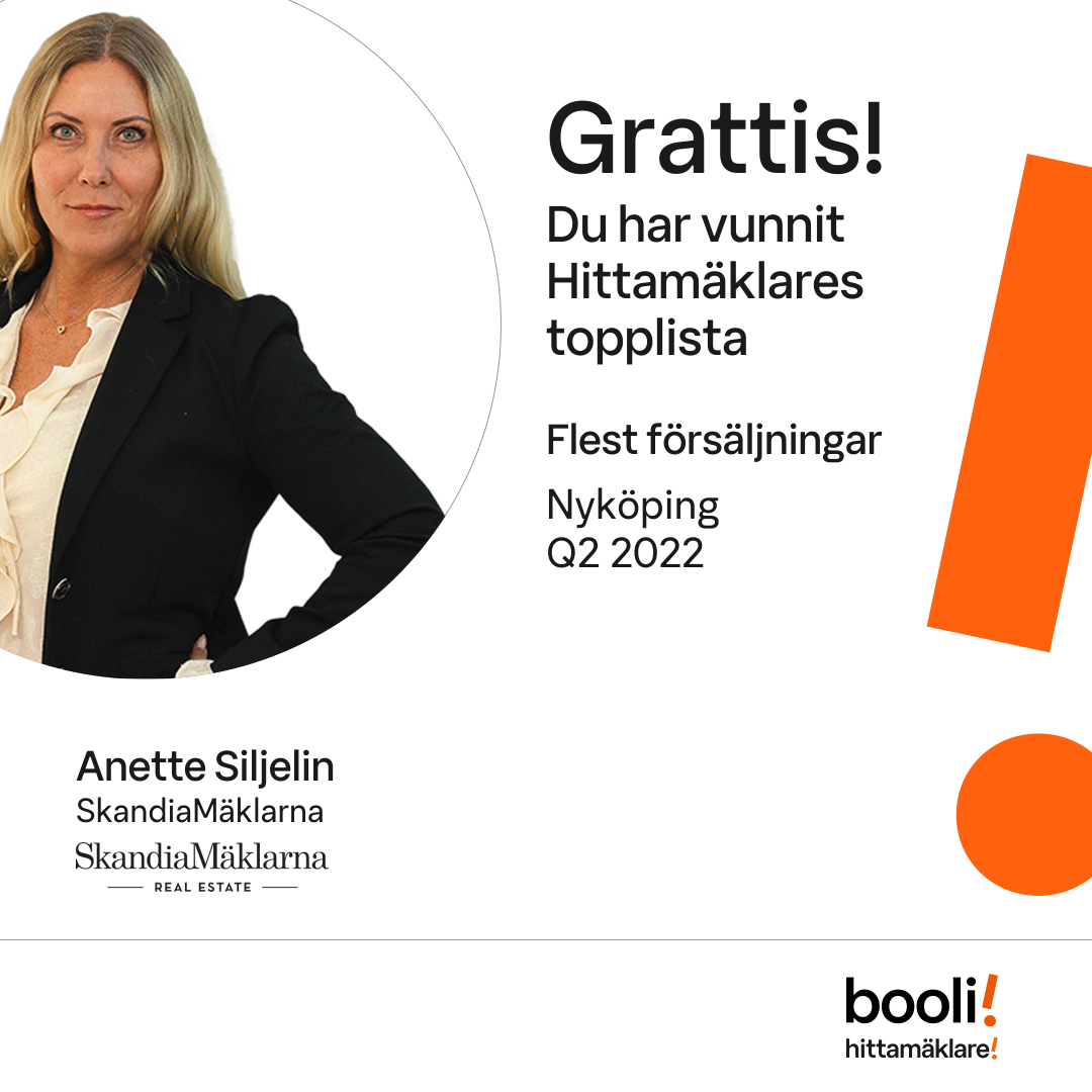Statistik för publicerade bostäder, försäljningar och omdömen baseras på data från Booli och Hittamäklare. Statistiken för försäljningar avser inrapporterade och verifierade slutpriser från mäklare eller av Booli inhämtade och verifierade slutpriser. Statistiken för publicerade bostäder baseras på information som publicerats på Booli.se. Statistik för omdömen och rekommendationer baseras på omdömen från säljare som lämnats via Booli och Hittamäklare.