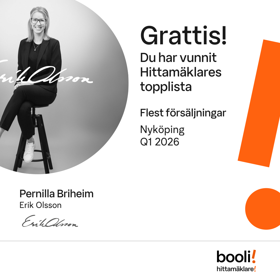 Statistik för publicerade bostäder, försäljningar och omdömen baseras på data från Booli. Statistiken för försäljningar avser inrapporterade och verifierade slutpriser från mäklare eller av Booli inhämtade och verifierade slutpriser. Statistiken för publicerade bostäder baseras på information som publicerats på Booli.se. Statistik för omdömen och rekommendationer baseras på omdömen från säljare som lämnats via Booli.