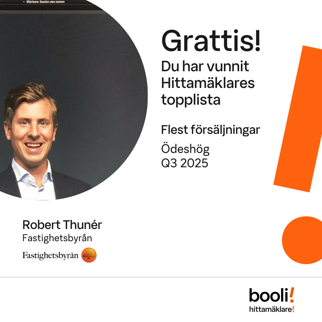 Statistik för publicerade bostäder, försäljningar och omdömen baseras på data från Booli och Hittamäklare. Statistiken för försäljningar avser inrapporterade och verifierade slutpriser från mäklare eller av Booli inhämtade och verifierade slutpriser. Statistiken för publicerade bostäder baseras på information som publicerats på Booli.se. Statistik för omdömen och rekommendationer baseras på omdömen från säljare som lämnats via Booli och Hittamäklare.