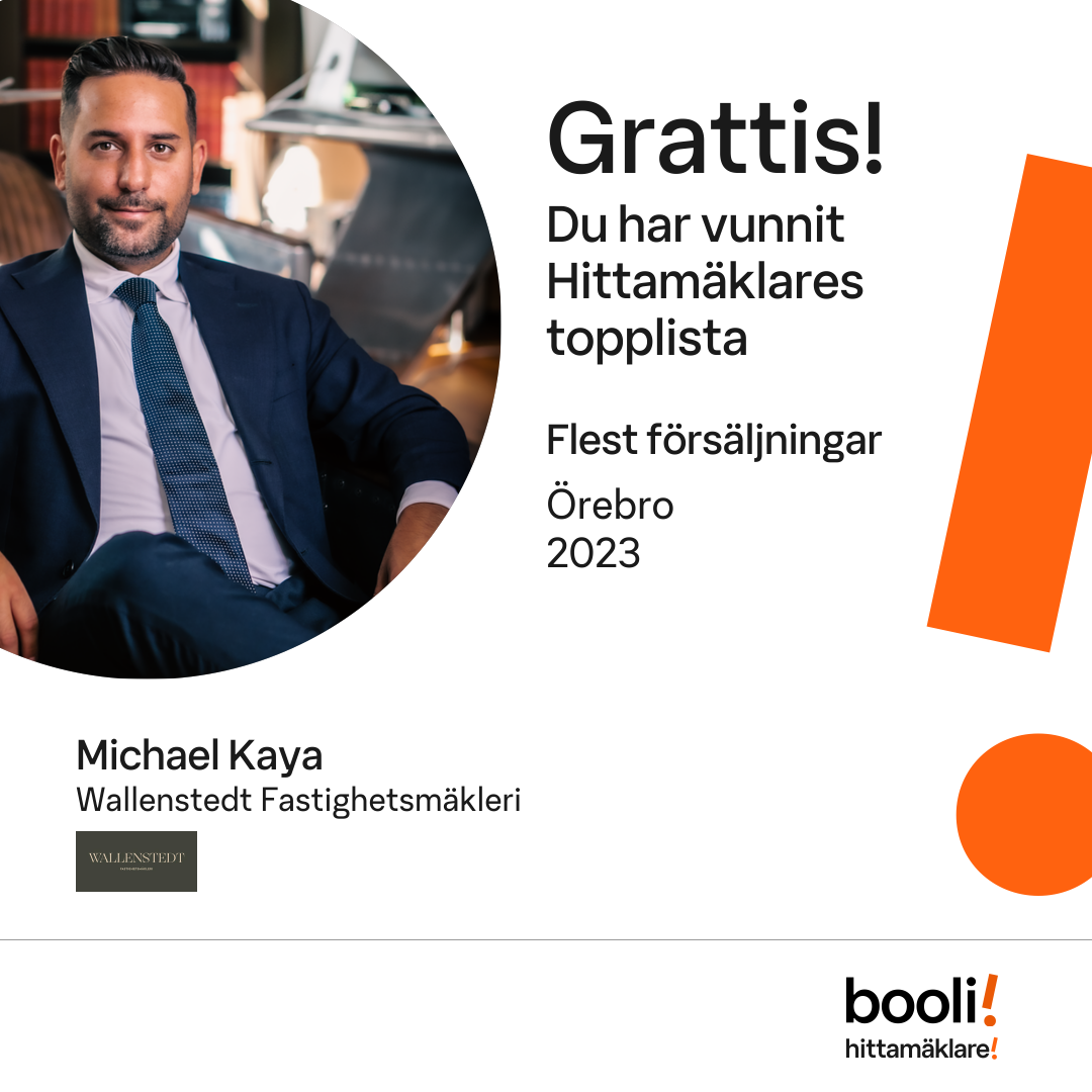 Statistik för publicerade bostäder, försäljningar och omdömen baseras på data från Booli och Hittamäklare. Statistiken för försäljningar avser inrapporterade och verifierade slutpriser från mäklare eller av Booli inhämtade och verifierade slutpriser. Statistiken för publicerade bostäder baseras på information som publicerats på Booli.se. Statistik för omdömen och rekommendationer baseras på omdömen från säljare som lämnats via Booli och Hittamäklare.