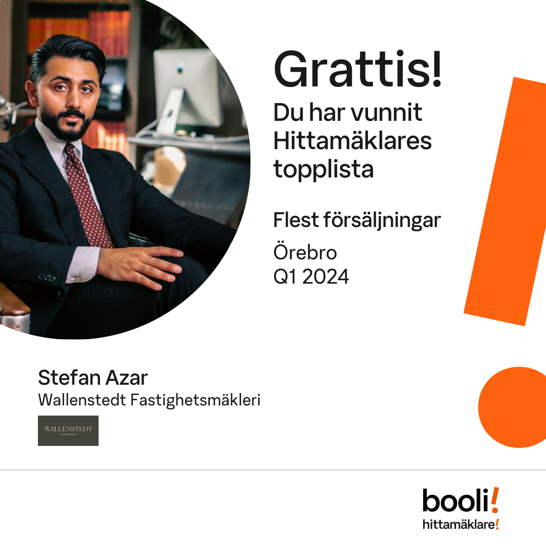 Statistik för publicerade bostäder, försäljningar och omdömen baseras på data från Booli och Hittamäklare. Statistiken för försäljningar avser inrapporterade och verifierade slutpriser från mäklare eller av Booli inhämtade och verifierade slutpriser. Statistiken för publicerade bostäder baseras på information som publicerats på Booli.se. Statistik för omdömen och rekommendationer baseras på omdömen från säljare som lämnats via Booli och Hittamäklare.