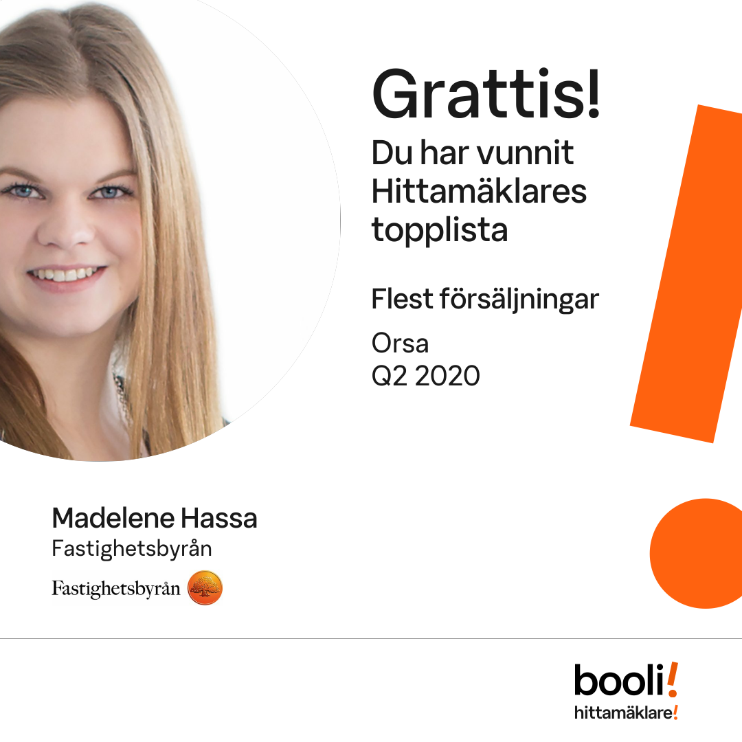Statistik för publicerade bostäder, försäljningar och omdömen baseras på data från Booli och Hittamäklare. Statistiken för försäljningar avser inrapporterade och verifierade slutpriser från mäklare eller av Booli inhämtade och verifierade slutpriser. Statistiken för publicerade bostäder baseras på information som publicerats på Booli.se. Statistik för omdömen och rekommendationer baseras på omdömen från säljare som lämnats via Booli och Hittamäklare.