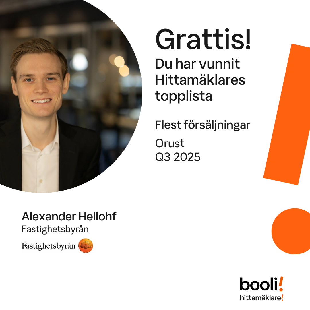 Statistik för publicerade bostäder, försäljningar och omdömen baseras på data från Booli och Hittamäklare. Statistiken för försäljningar avser inrapporterade och verifierade slutpriser från mäklare eller av Booli inhämtade och verifierade slutpriser. Statistiken för publicerade bostäder baseras på information som publicerats på Booli.se. Statistik för omdömen och rekommendationer baseras på omdömen från säljare som lämnats via Booli och Hittamäklare.