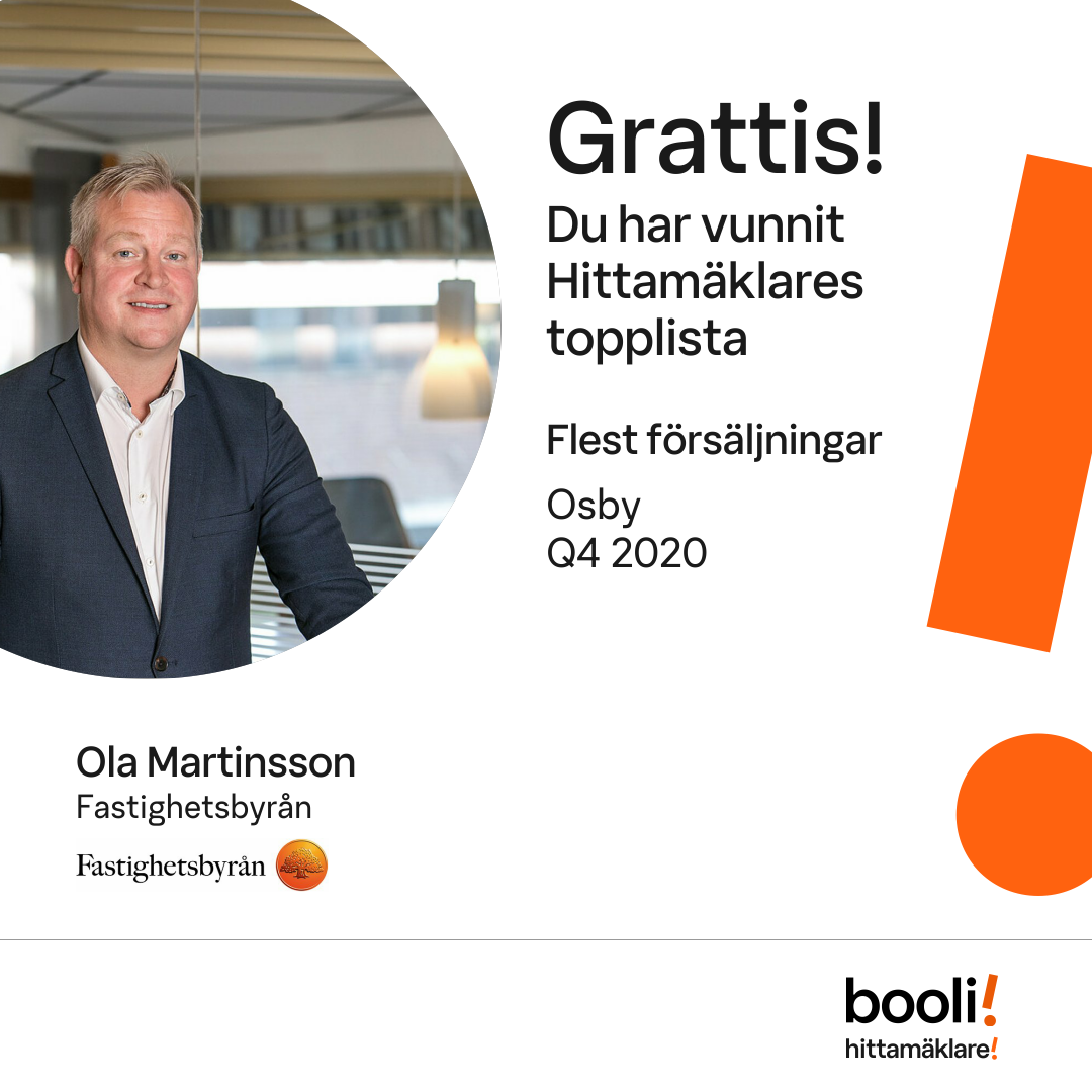 Statistik för publicerade bostäder, försäljningar och omdömen baseras på data från Booli och Hittamäklare. Statistiken för försäljningar avser inrapporterade och verifierade slutpriser från mäklare eller av Booli inhämtade och verifierade slutpriser. Statistiken för publicerade bostäder baseras på information som publicerats på Booli.se. Statistik för omdömen och rekommendationer baseras på omdömen från säljare som lämnats via Booli och Hittamäklare.