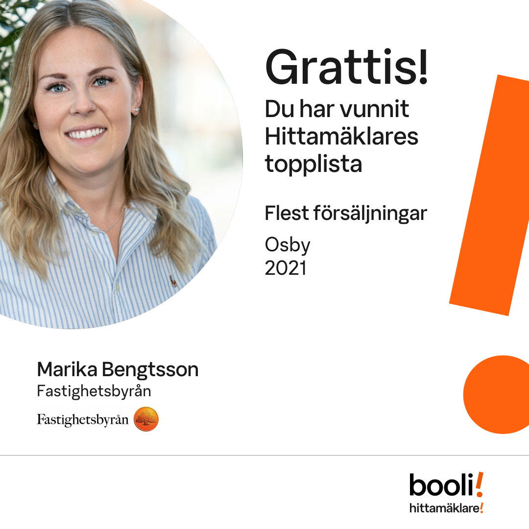 Statistik för publicerade bostäder, försäljningar och omdömen baseras på data från Booli och Hittamäklare. Statistiken för försäljningar avser inrapporterade och verifierade slutpriser från mäklare eller av Booli inhämtade och verifierade slutpriser. Statistiken för publicerade bostäder baseras på information som publicerats på Booli.se. Statistik för omdömen och rekommendationer baseras på omdömen från säljare som lämnats via Booli och Hittamäklare.