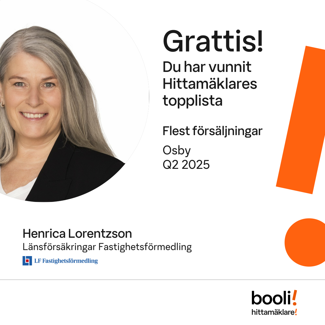 Statistik för publicerade bostäder, försäljningar och omdömen baseras på data från Booli och Hittamäklare. Statistiken för försäljningar avser inrapporterade och verifierade slutpriser från mäklare eller av Booli inhämtade och verifierade slutpriser. Statistiken för publicerade bostäder baseras på information som publicerats på Booli.se. Statistik för omdömen och rekommendationer baseras på omdömen från säljare som lämnats via Booli och Hittamäklare.