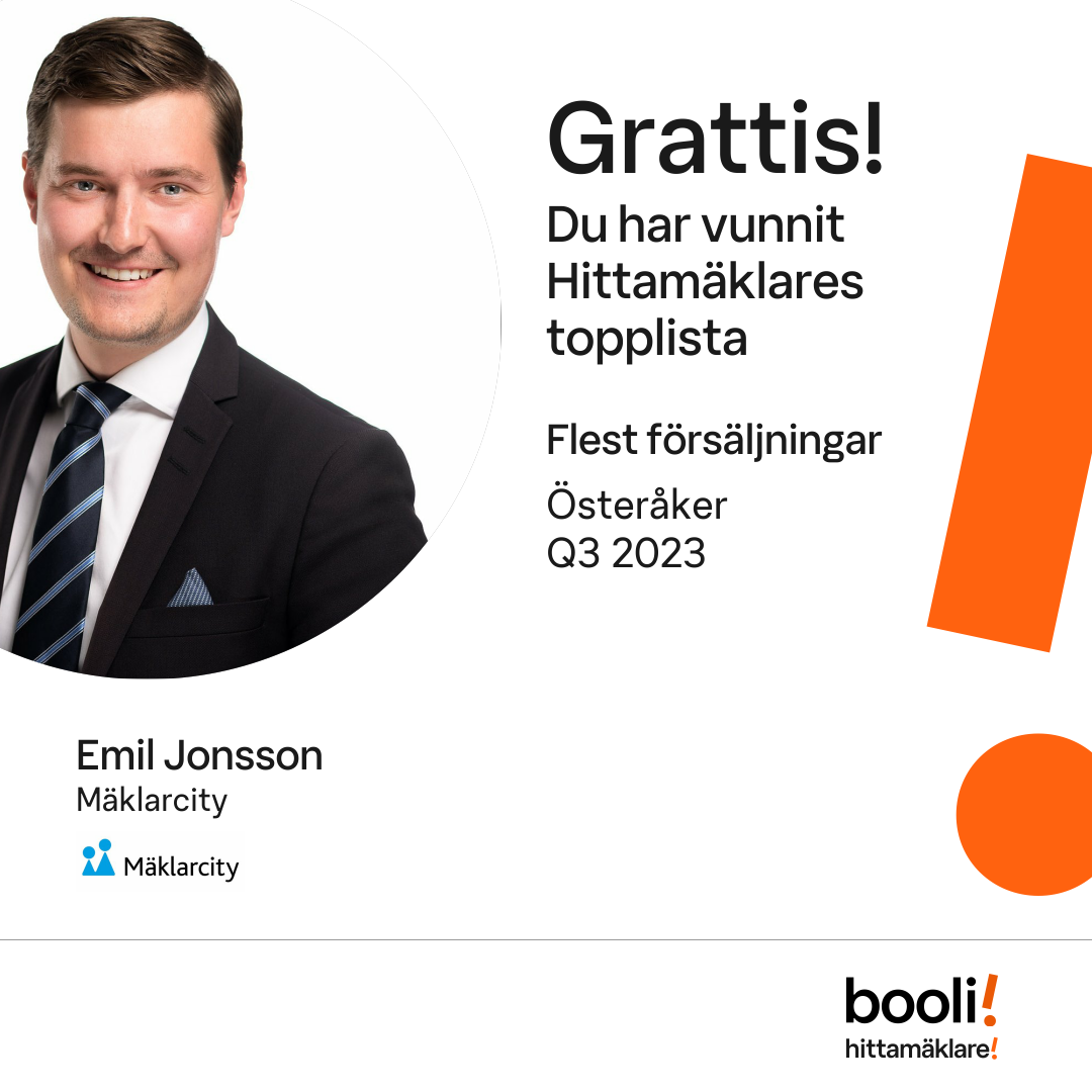 Statistik för publicerade bostäder, försäljningar och omdömen baseras på data från Booli och Hittamäklare. Statistiken för försäljningar avser inrapporterade och verifierade slutpriser från mäklare eller av Booli inhämtade och verifierade slutpriser. Statistiken för publicerade bostäder baseras på information som publicerats på Booli.se. Statistik för omdömen och rekommendationer baseras på omdömen från säljare som lämnats via Booli och Hittamäklare.