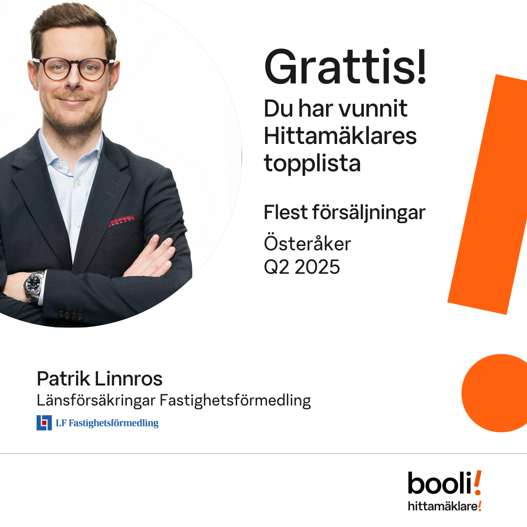 Statistik för publicerade bostäder, försäljningar och omdömen baseras på data från Booli. Statistiken för försäljningar avser inrapporterade och verifierade slutpriser från mäklare eller av Booli inhämtade och verifierade slutpriser. Statistiken för publicerade bostäder baseras på information som publicerats på Booli.se. Statistik för omdömen och rekommendationer baseras på omdömen från säljare som lämnats via Booli.