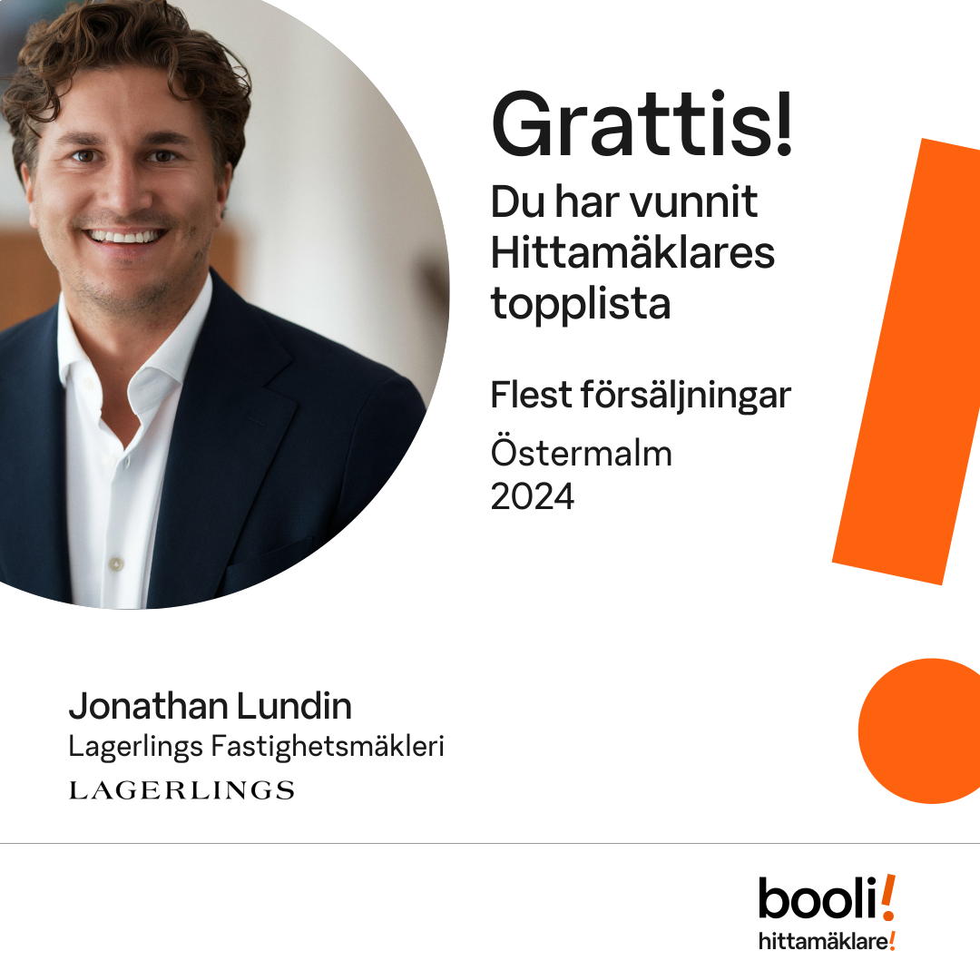 Statistik för publicerade bostäder, försäljningar och omdömen baseras på data från Booli och Hittamäklare. Statistiken för försäljningar avser inrapporterade och verifierade slutpriser från mäklare eller av Booli inhämtade och verifierade slutpriser. Statistiken för publicerade bostäder baseras på information som publicerats på Booli.se. Statistik för omdömen och rekommendationer baseras på omdömen från säljare som lämnats via Booli och Hittamäklare.
