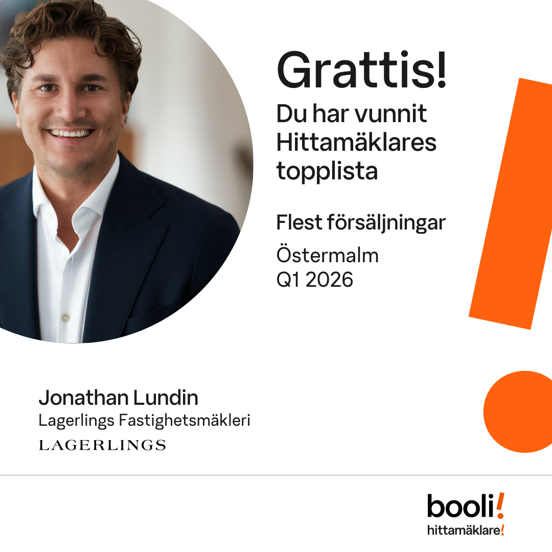 Statistik för publicerade bostäder, försäljningar och omdömen baseras på data från Booli och Hittamäklare. Statistiken för försäljningar avser inrapporterade och verifierade slutpriser från mäklare eller av Booli inhämtade och verifierade slutpriser. Statistiken för publicerade bostäder baseras på information som publicerats på Booli.se. Statistik för omdömen och rekommendationer baseras på omdömen från säljare som lämnats via Booli och Hittamäklare.