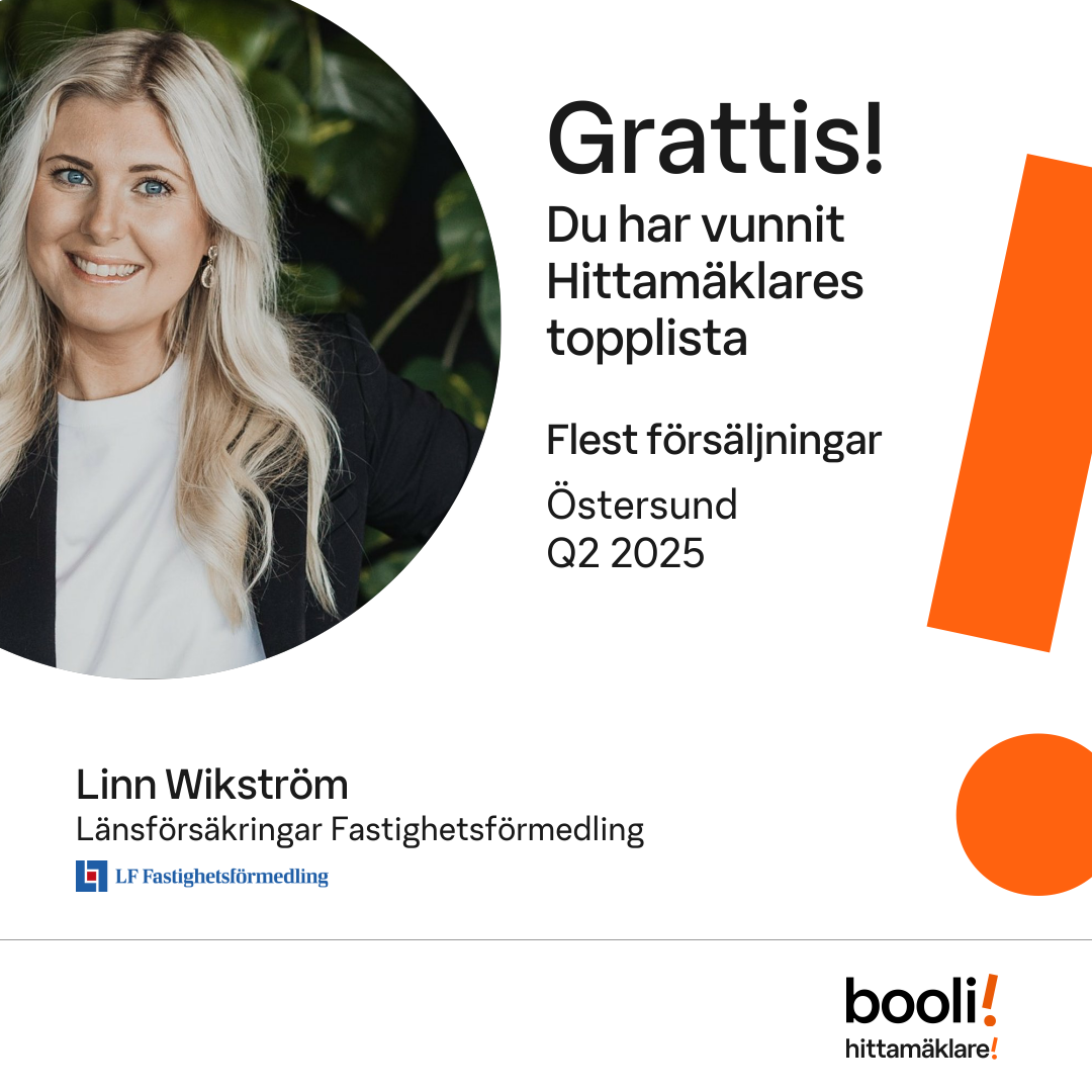 Statistik för publicerade bostäder, försäljningar och omdömen baseras på data från Booli och Hittamäklare. Statistiken för försäljningar avser inrapporterade och verifierade slutpriser från mäklare eller av Booli inhämtade och verifierade slutpriser. Statistiken för publicerade bostäder baseras på information som publicerats på Booli.se. Statistik för omdömen och rekommendationer baseras på omdömen från säljare som lämnats via Booli och Hittamäklare.