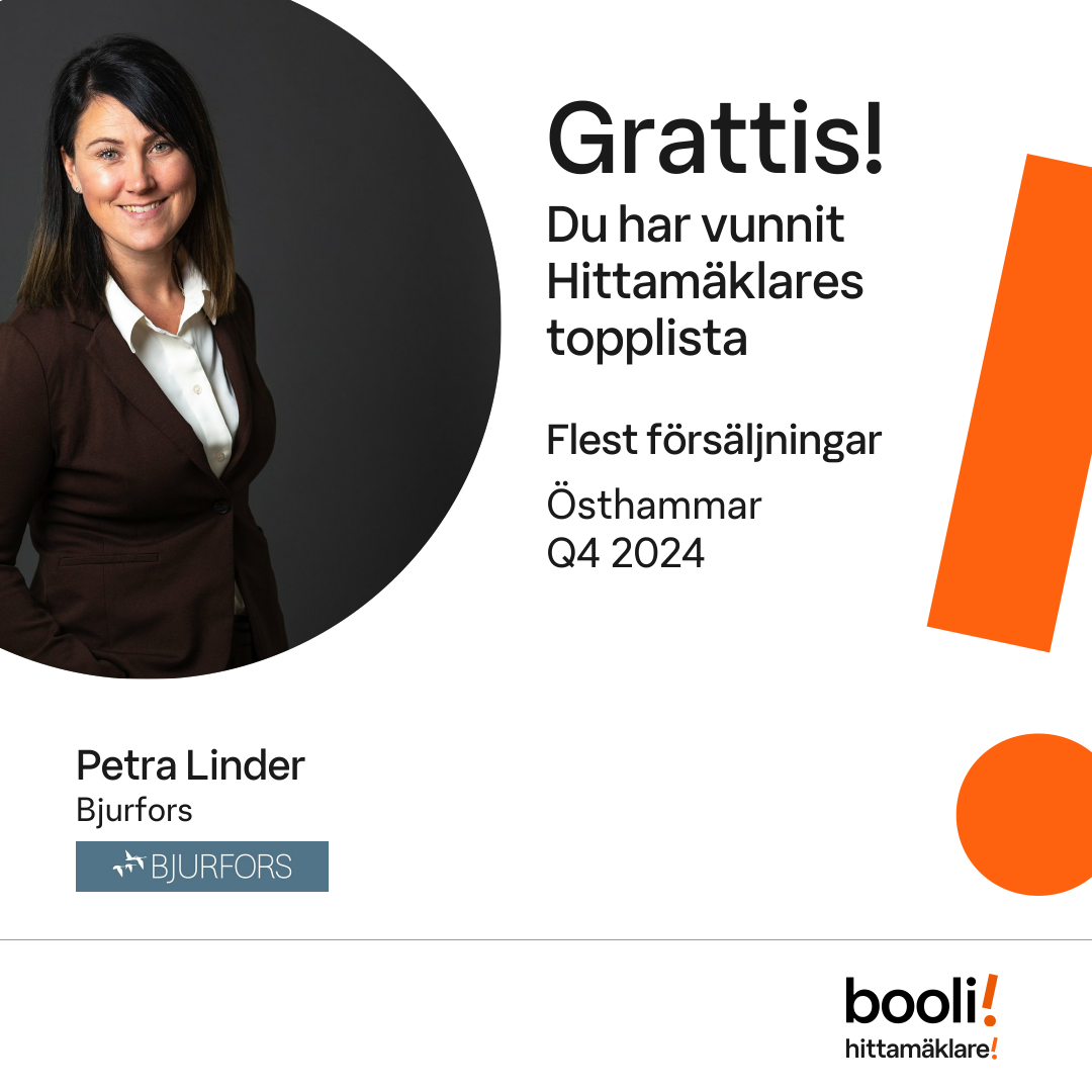 Statistik för publicerade bostäder, försäljningar och omdömen baseras på data från Booli och Hittamäklare. Statistiken för försäljningar avser inrapporterade och verifierade slutpriser från mäklare eller av Booli inhämtade och verifierade slutpriser. Statistiken för publicerade bostäder baseras på information som publicerats på Booli.se. Statistik för omdömen och rekommendationer baseras på omdömen från säljare som lämnats via Booli och Hittamäklare.
