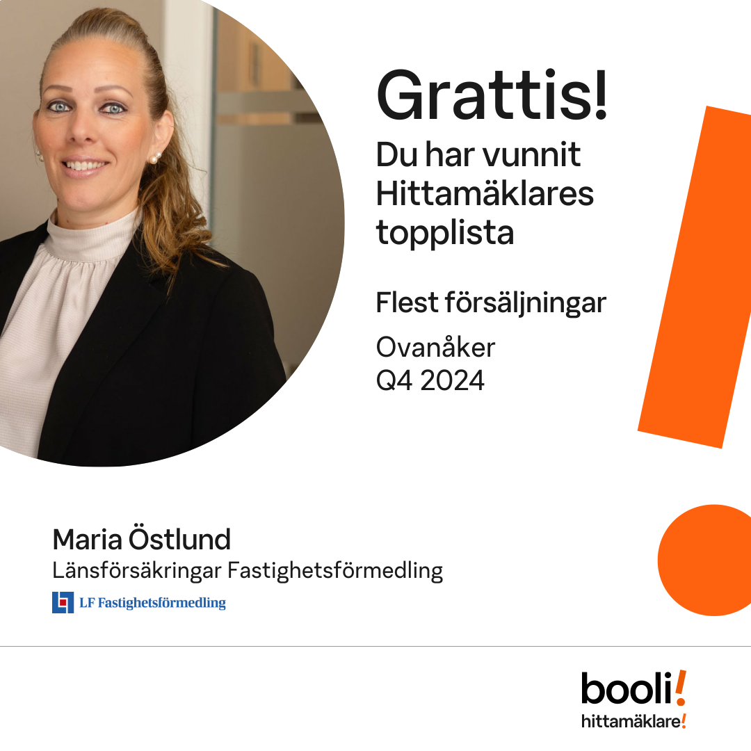 Statistik för publicerade bostäder, försäljningar och omdömen baseras på data från Booli och Hittamäklare. Statistiken för försäljningar avser inrapporterade och verifierade slutpriser från mäklare eller av Booli inhämtade och verifierade slutpriser. Statistiken för publicerade bostäder baseras på information som publicerats på Booli.se. Statistik för omdömen och rekommendationer baseras på omdömen från säljare som lämnats via Booli och Hittamäklare.