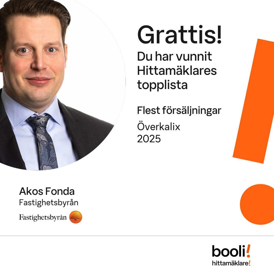 Statistik för publicerade bostäder, försäljningar och omdömen baseras på data från Booli och Hittamäklare. Statistiken för försäljningar avser inrapporterade och verifierade slutpriser från mäklare eller av Booli inhämtade och verifierade slutpriser. Statistiken för publicerade bostäder baseras på information som publicerats på Booli.se. Statistik för omdömen och rekommendationer baseras på omdömen från säljare som lämnats via Booli och Hittamäklare.