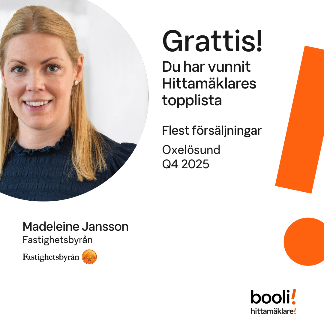 Statistik för publicerade bostäder, försäljningar och omdömen baseras på data från Booli. Statistiken för försäljningar avser inrapporterade och verifierade slutpriser från mäklare eller av Booli inhämtade och verifierade slutpriser. Statistiken för publicerade bostäder baseras på information som publicerats på Booli.se. Statistik för omdömen och rekommendationer baseras på omdömen från säljare som lämnats via Booli.