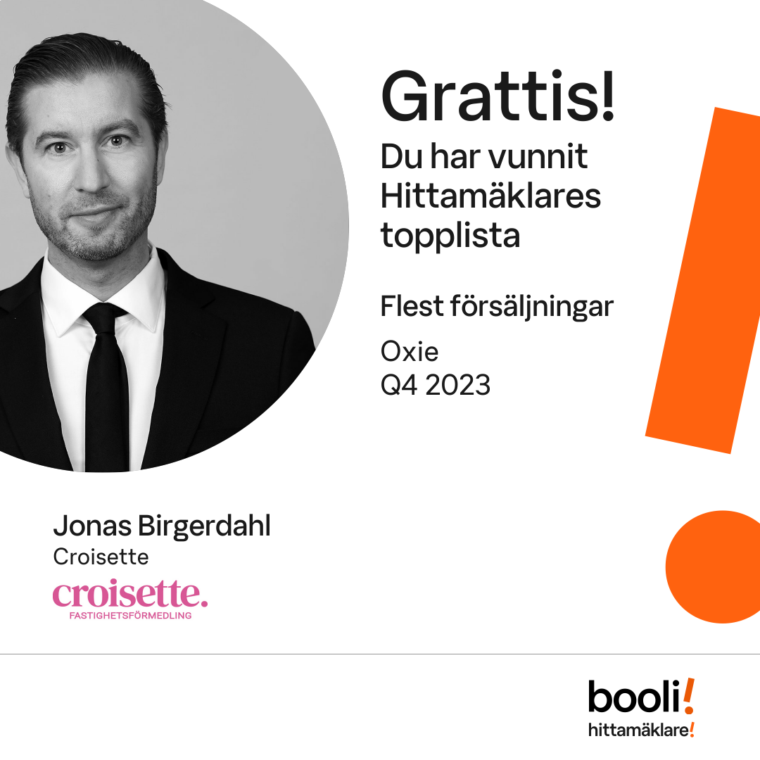Statistik för publicerade bostäder, försäljningar och omdömen baseras på data från Booli och Hittamäklare. Statistiken för försäljningar avser inrapporterade och verifierade slutpriser från mäklare eller av Booli inhämtade och verifierade slutpriser. Statistiken för publicerade bostäder baseras på information som publicerats på Booli.se. Statistik för omdömen och rekommendationer baseras på omdömen från säljare som lämnats via Booli och Hittamäklare.