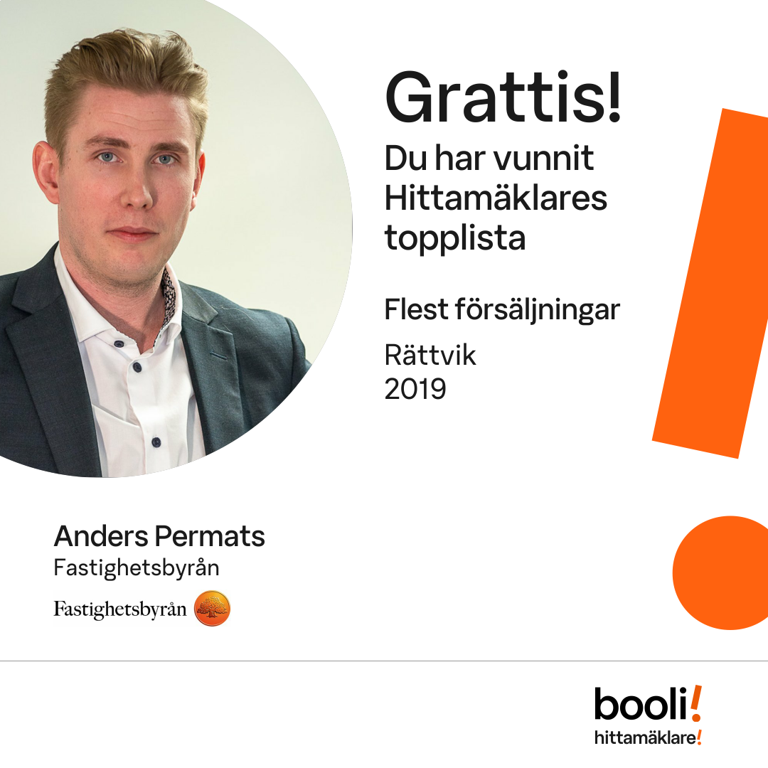 Statistik för publicerade bostäder, försäljningar och omdömen baseras på data från Booli och Hittamäklare. Statistiken för försäljningar avser inrapporterade och verifierade slutpriser från mäklare eller av Booli inhämtade och verifierade slutpriser. Statistiken för publicerade bostäder baseras på information som publicerats på Booli.se. Statistik för omdömen och rekommendationer baseras på omdömen från säljare som lämnats via Booli och Hittamäklare.