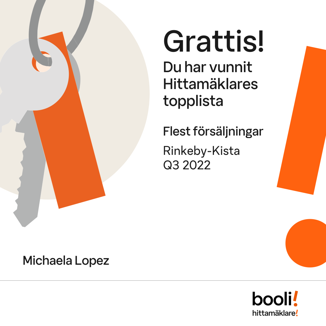 Statistik för publicerade bostäder, försäljningar och omdömen baseras på data från Booli och Hittamäklare. Statistiken för försäljningar avser inrapporterade och verifierade slutpriser från mäklare eller av Booli inhämtade och verifierade slutpriser. Statistiken för publicerade bostäder baseras på information som publicerats på Booli.se. Statistik för omdömen och rekommendationer baseras på omdömen från säljare som lämnats via Booli och Hittamäklare.