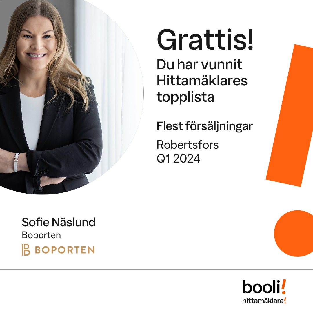 Statistik för publicerade bostäder, försäljningar och omdömen baseras på data från Booli och Hittamäklare. Statistiken för försäljningar avser inrapporterade och verifierade slutpriser från mäklare eller av Booli inhämtade och verifierade slutpriser. Statistiken för publicerade bostäder baseras på information som publicerats på Booli.se. Statistik för omdömen och rekommendationer baseras på omdömen från säljare som lämnats via Booli och Hittamäklare.