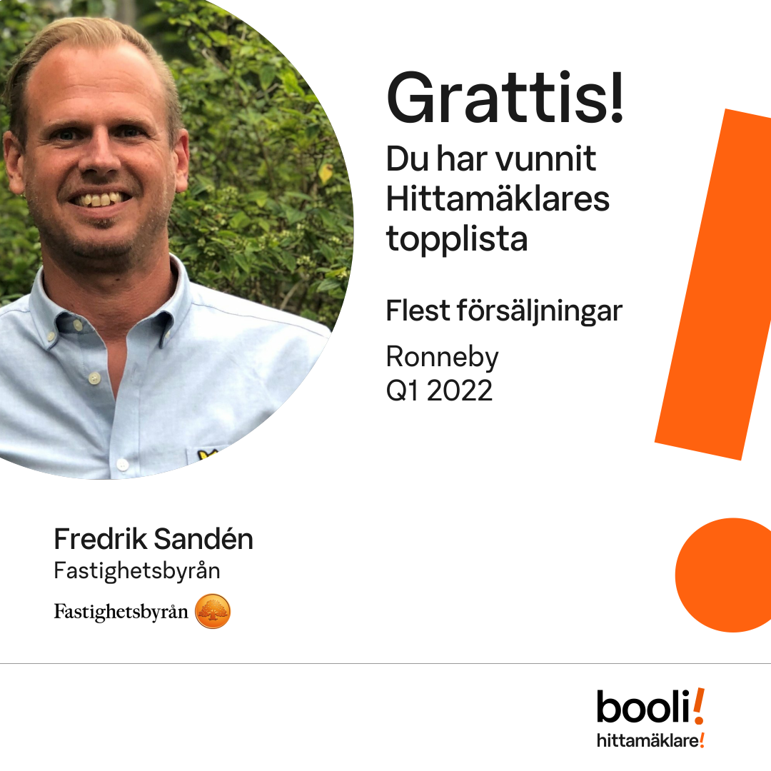 Statistik för publicerade bostäder, försäljningar och omdömen baseras på data från Booli och Hittamäklare. Statistiken för försäljningar avser inrapporterade och verifierade slutpriser från mäklare eller av Booli inhämtade och verifierade slutpriser. Statistiken för publicerade bostäder baseras på information som publicerats på Booli.se. Statistik för omdömen och rekommendationer baseras på omdömen från säljare som lämnats via Booli och Hittamäklare.