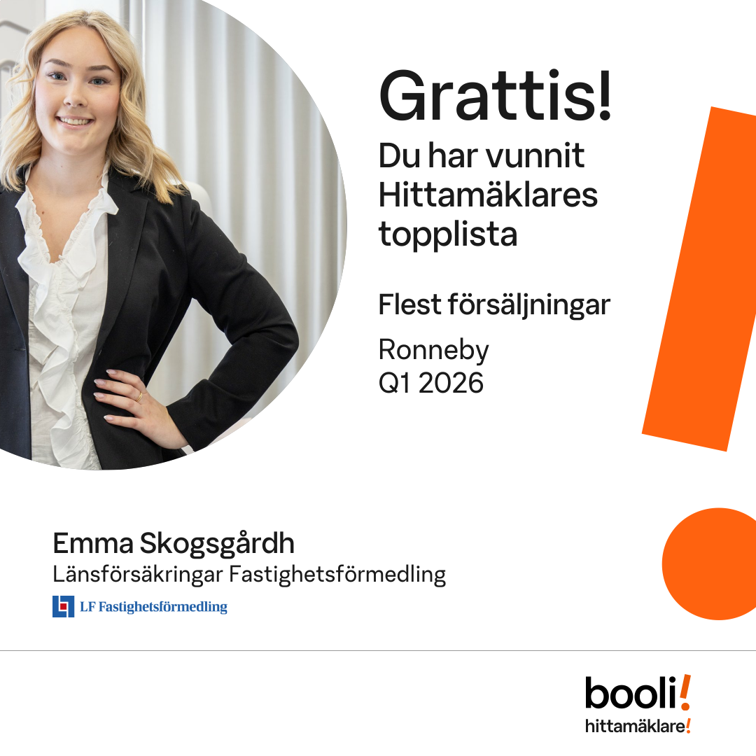 Statistik för publicerade bostäder, försäljningar och omdömen baseras på data från Booli. Statistiken för försäljningar avser inrapporterade och verifierade slutpriser från mäklare eller av Booli inhämtade och verifierade slutpriser. Statistiken för publicerade bostäder baseras på information som publicerats på Booli.se. Statistik för omdömen och rekommendationer baseras på omdömen från säljare som lämnats via Booli.