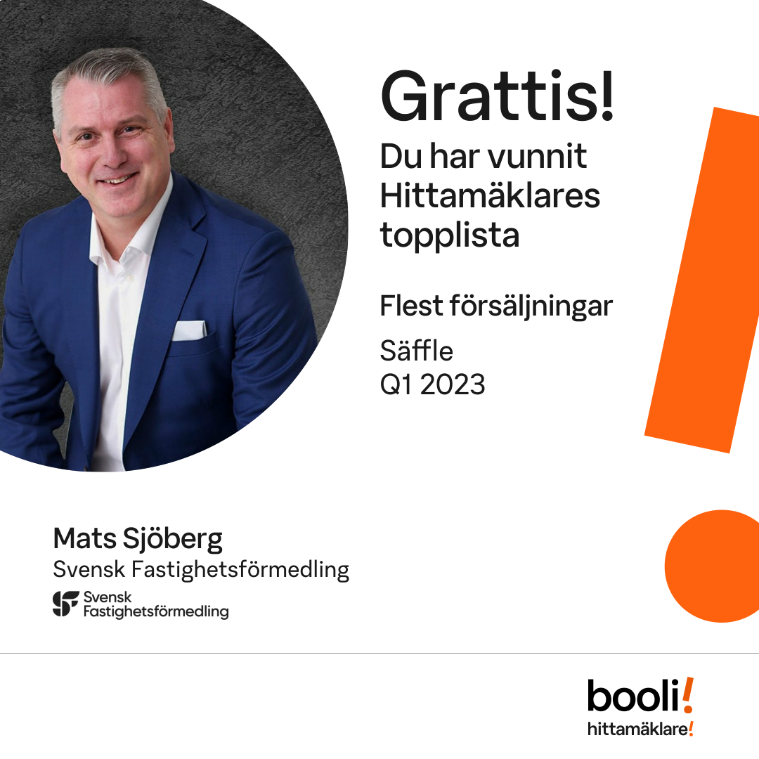 Statistik för publicerade bostäder, försäljningar och omdömen baseras på data från Booli. Statistiken för försäljningar avser inrapporterade och verifierade slutpriser från mäklare eller av Booli inhämtade och verifierade slutpriser. Statistiken för publicerade bostäder baseras på information som publicerats på Booli.se. Statistik för omdömen och rekommendationer baseras på omdömen från säljare som lämnats via Booli.