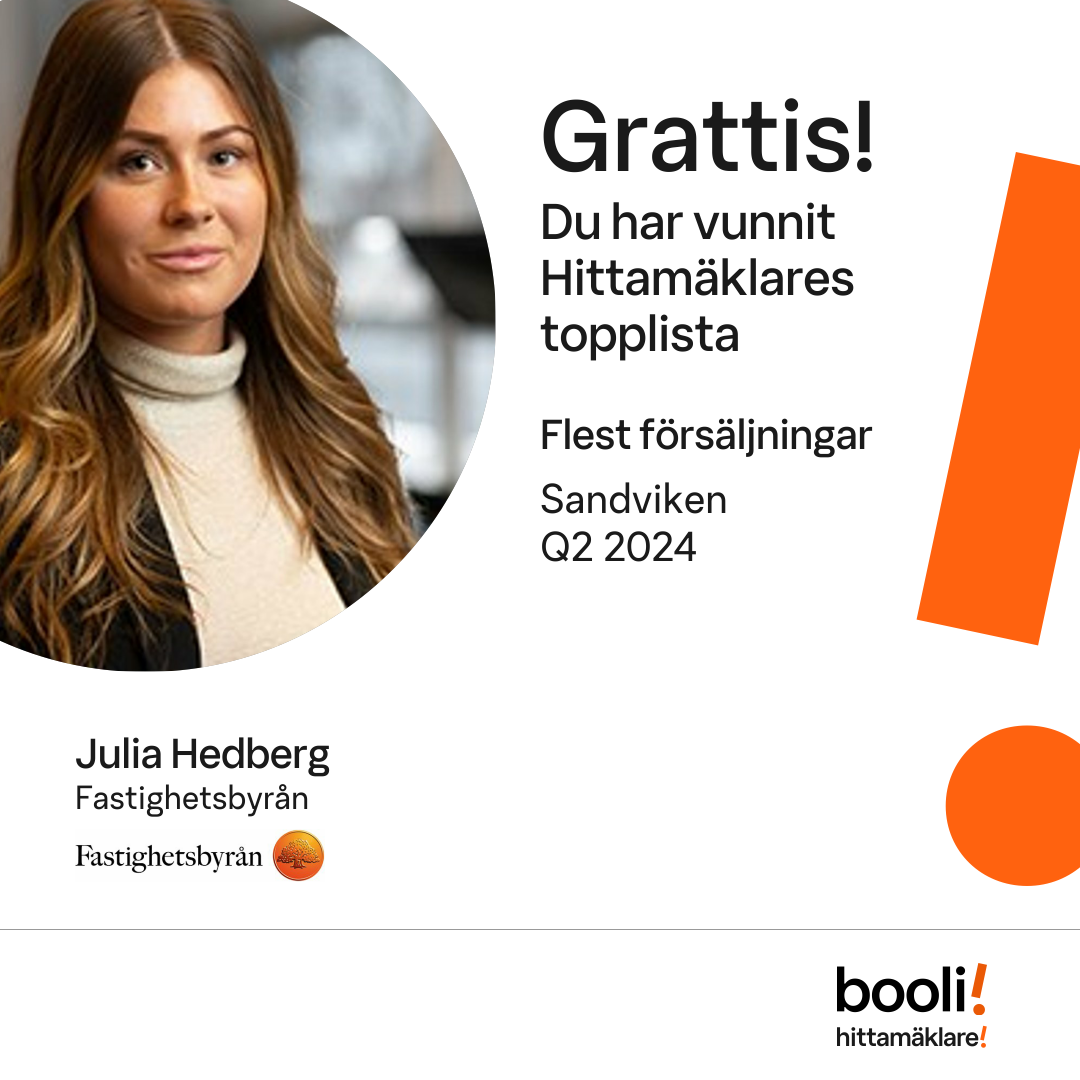 Statistik för publicerade bostäder, försäljningar och omdömen baseras på data från Booli och Hittamäklare. Statistiken för försäljningar avser inrapporterade och verifierade slutpriser från mäklare eller av Booli inhämtade och verifierade slutpriser. Statistiken för publicerade bostäder baseras på information som publicerats på Booli.se. Statistik för omdömen och rekommendationer baseras på omdömen från säljare som lämnats via Booli och Hittamäklare.